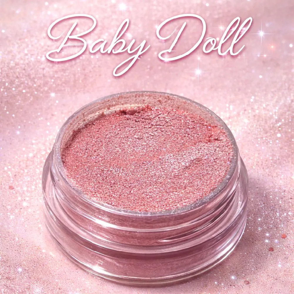 Baby Doll is a high-shine, rose-pink loose pigment with a luminous pearl reflect that melts into the skin and catches light from every angle.
