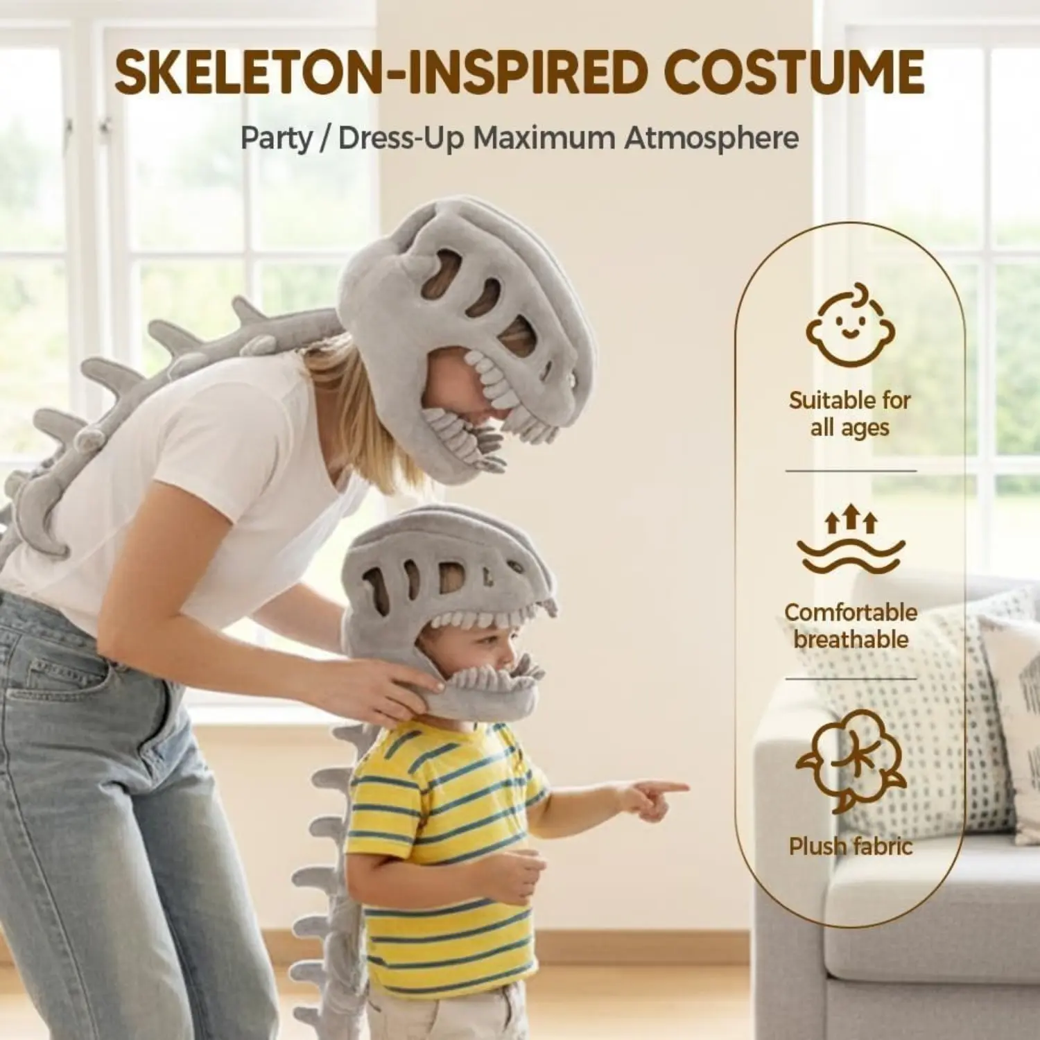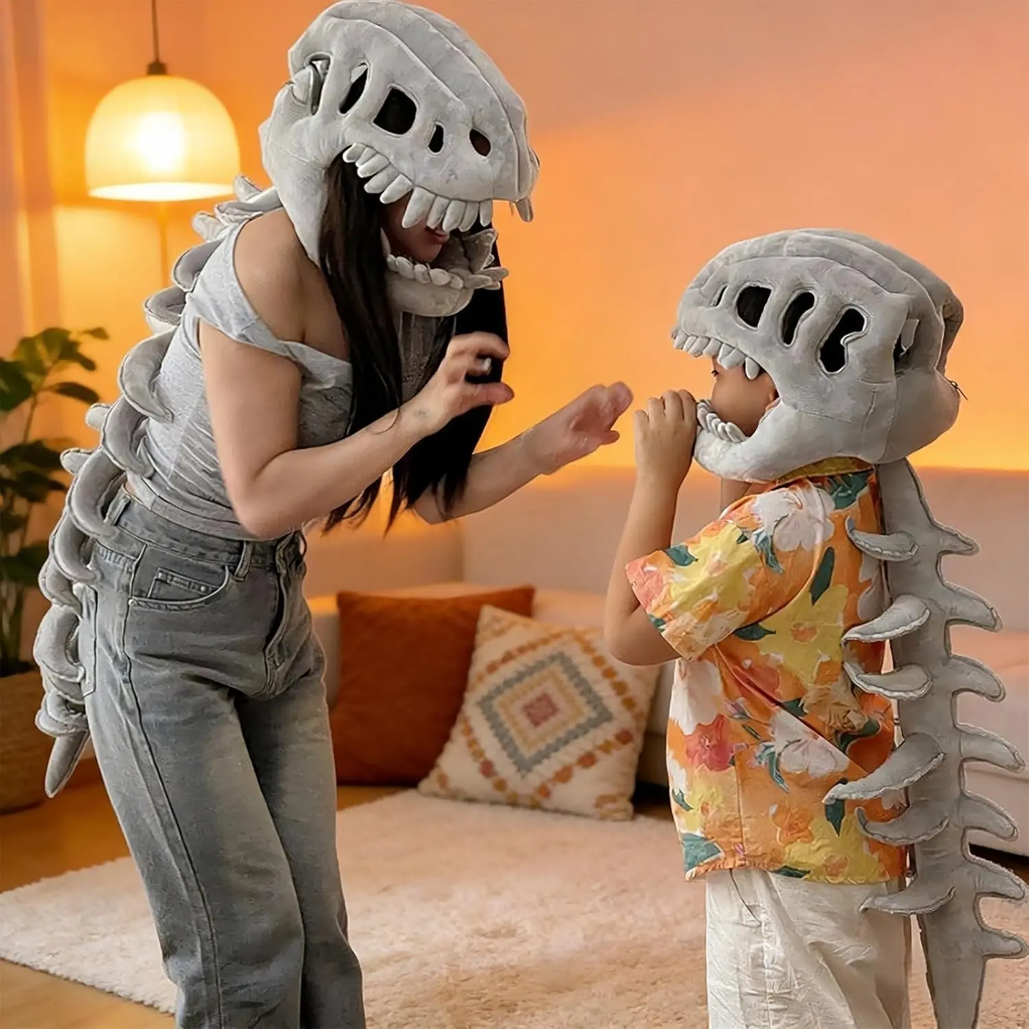 【Skull Headpiece】: Includes a plush skull headpiece, enhancing the overall dinosaur appearance.