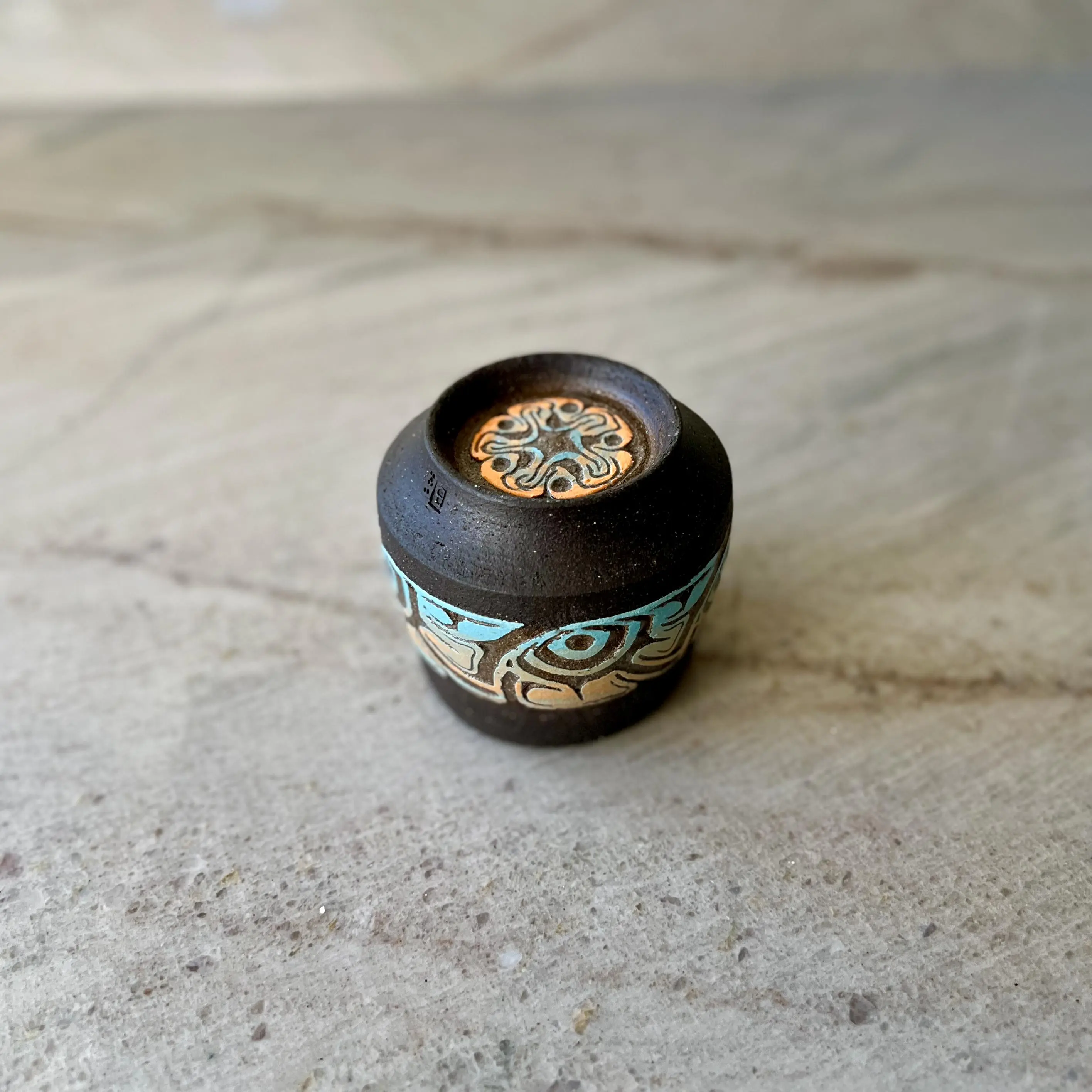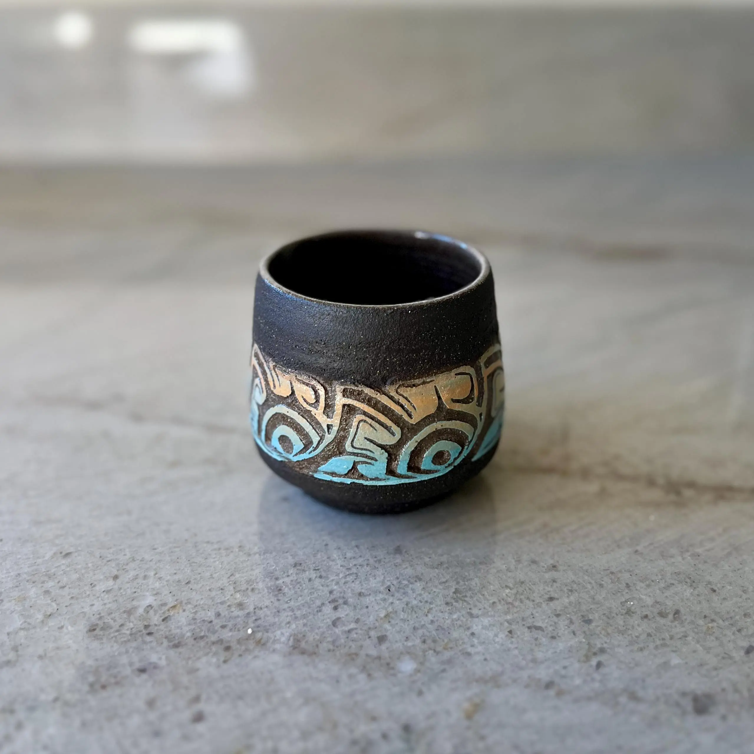 Charcoal Cup with Blue and Orange Carving