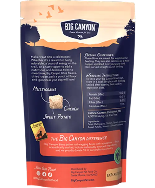 Big Canyon Bites with Chicken pack big, bold taste into every small bite. Whether you're training, adventuring, or adding a topper to mealtime, these freeze-dried treats are a hit with dogs everywhere. Made with just six premium ingredients, they're simple, wholesome, and guaranteed to get tails wagging.