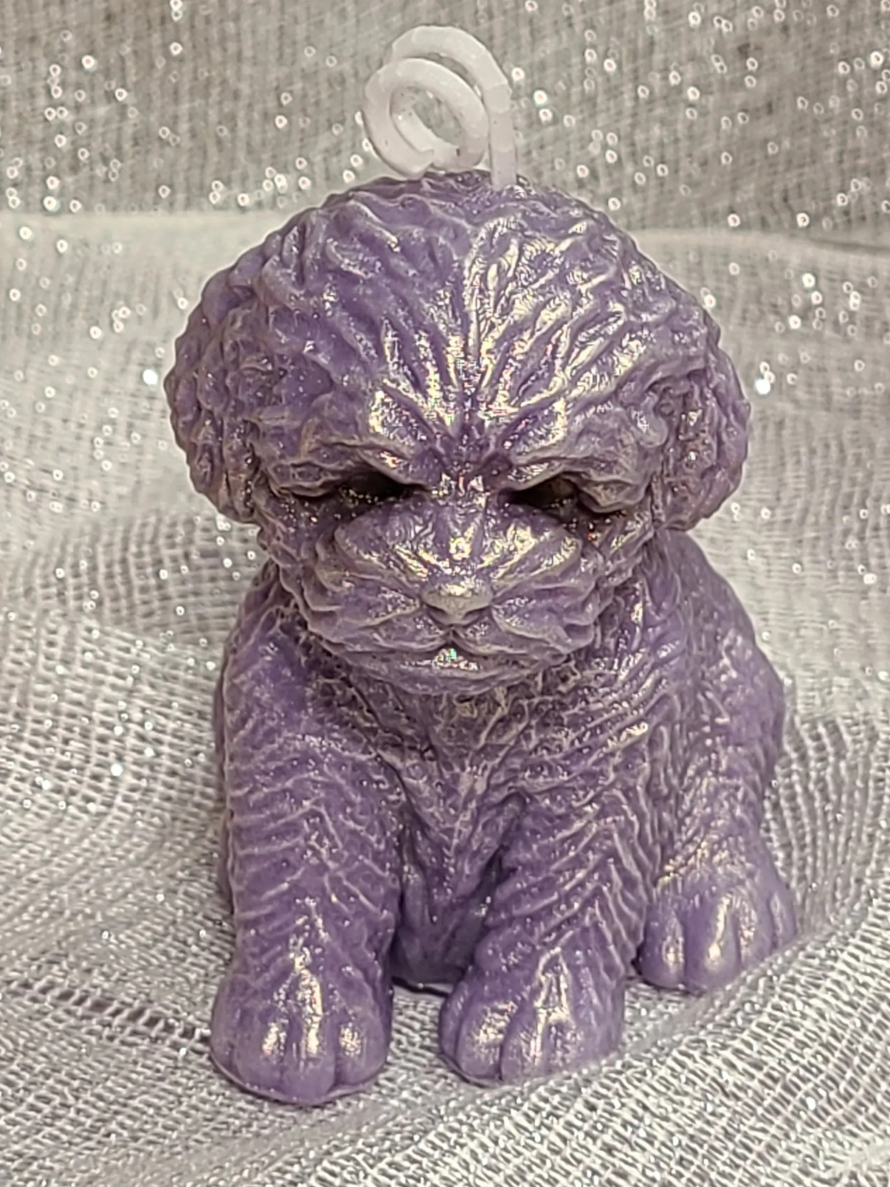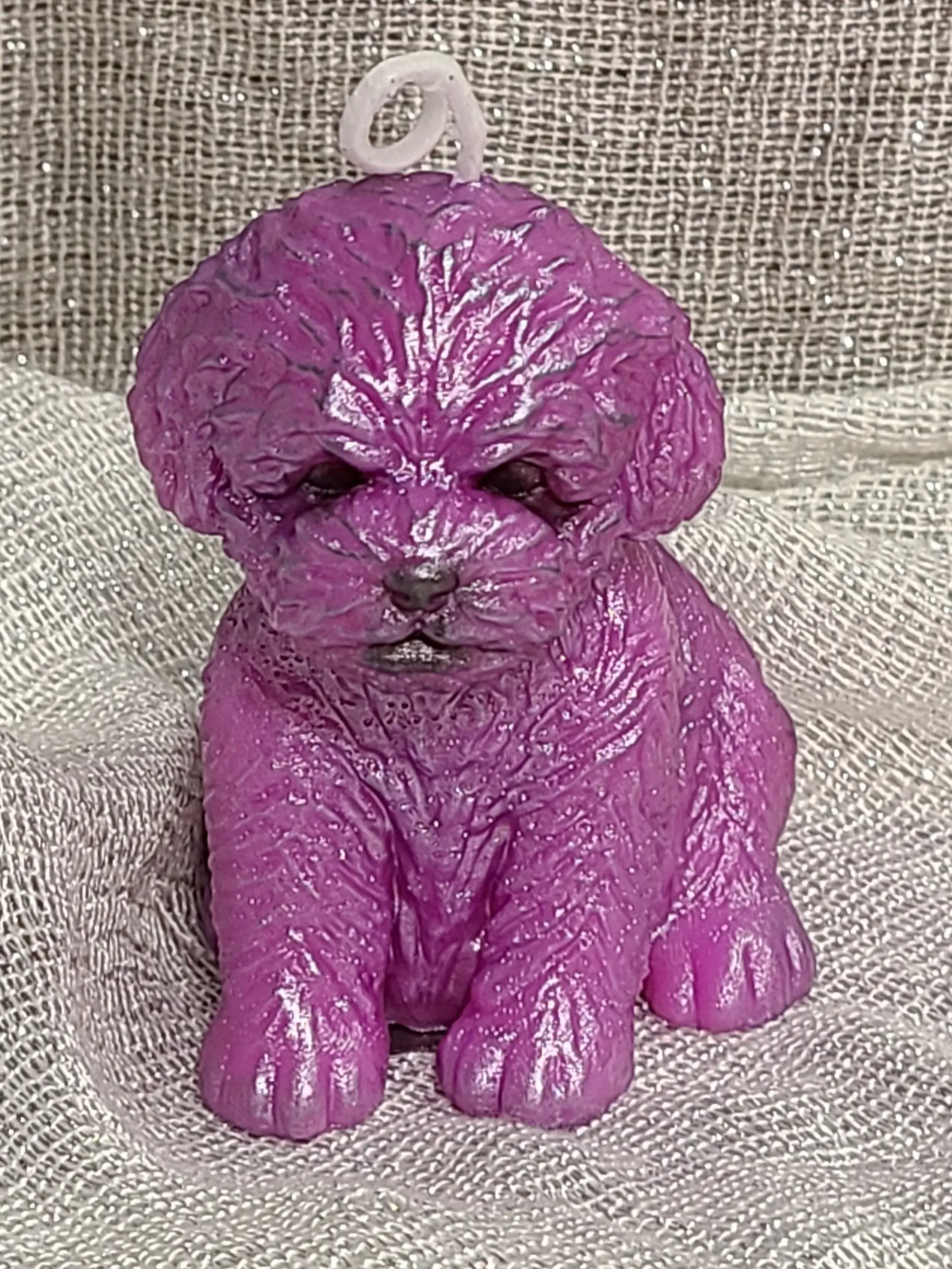 This adorable fluffy dog is made of parasoy wax with details highlighted in shimmery mica. Customize with your choice of color and scent.