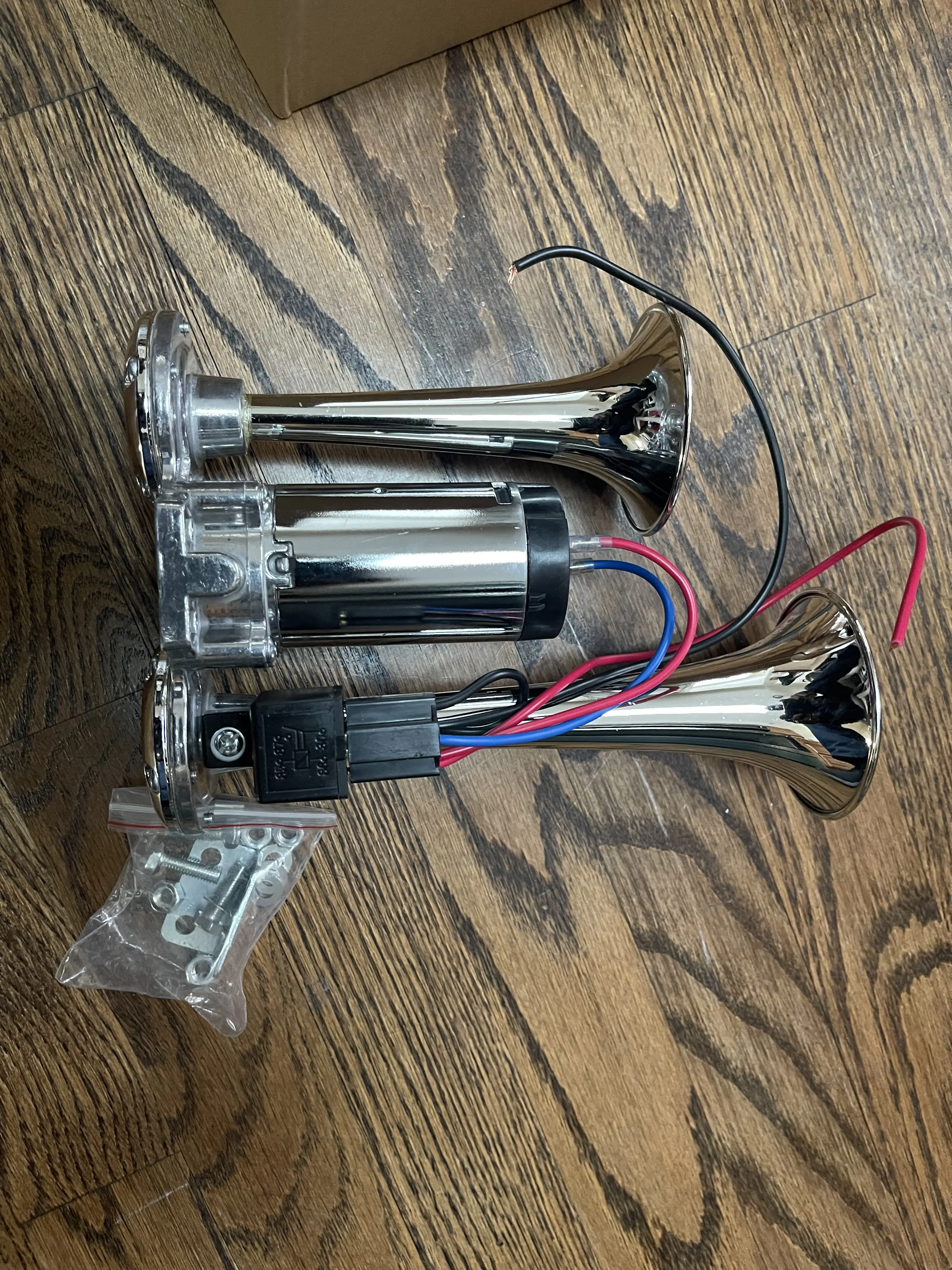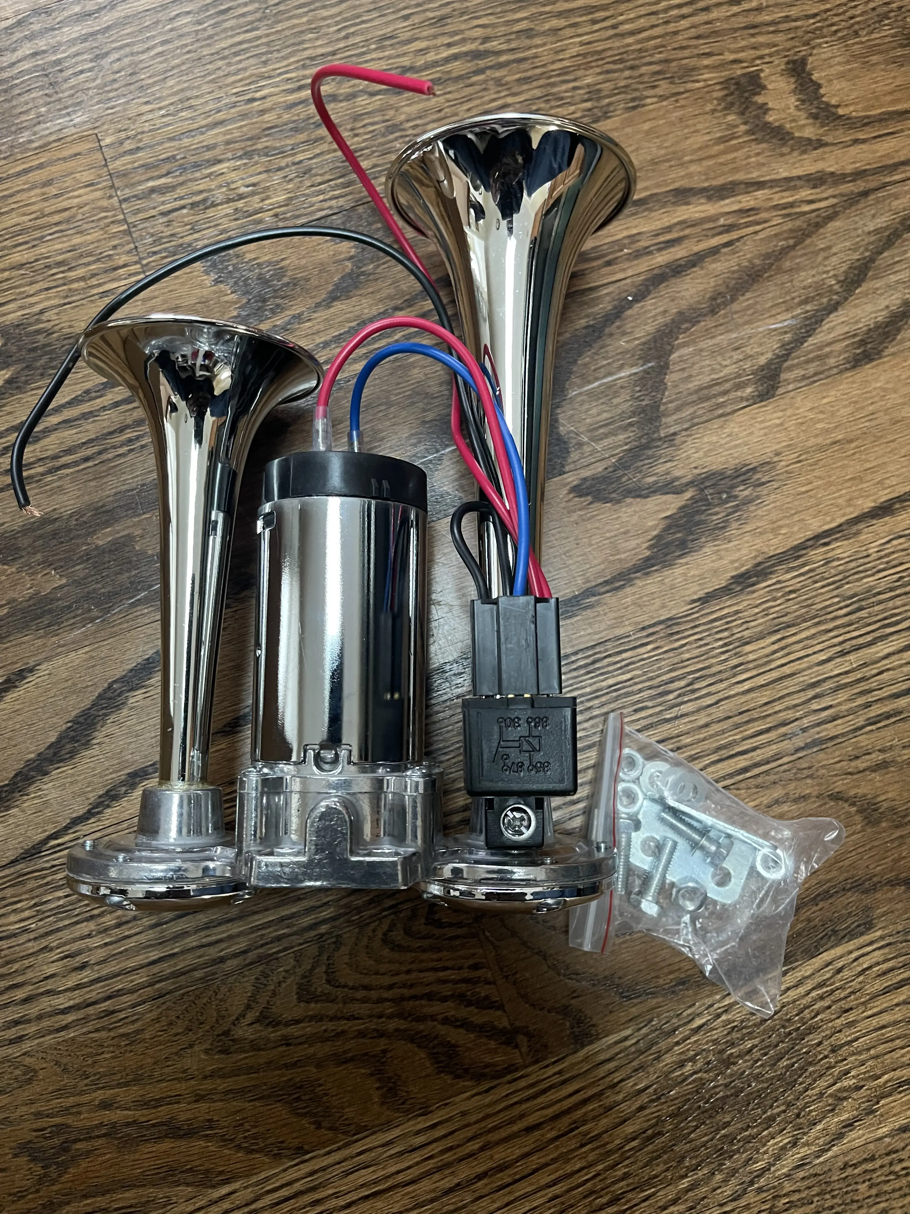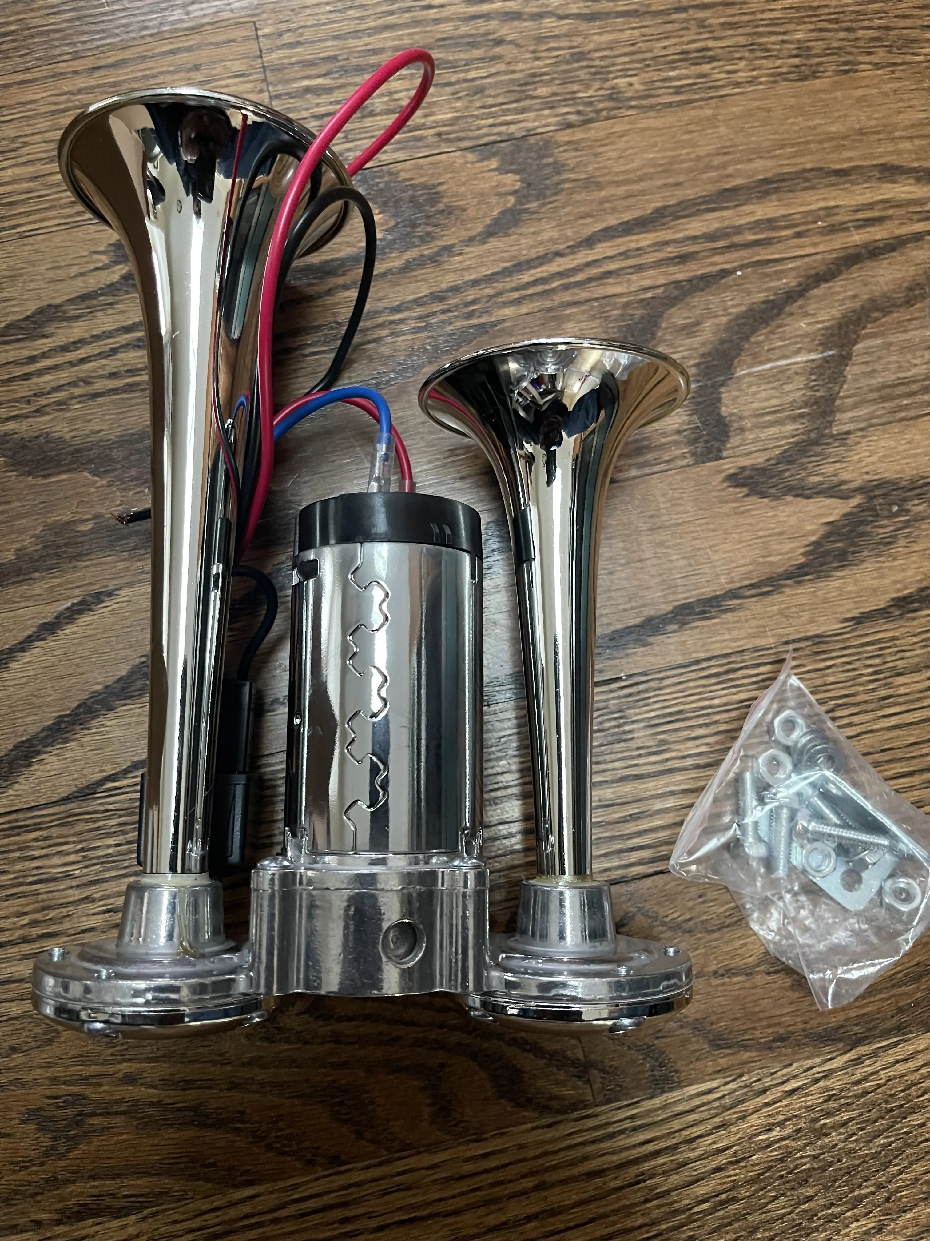 Powerful and loud double trumpet air horn, comes with compressor attached. Easy installation. Brand New