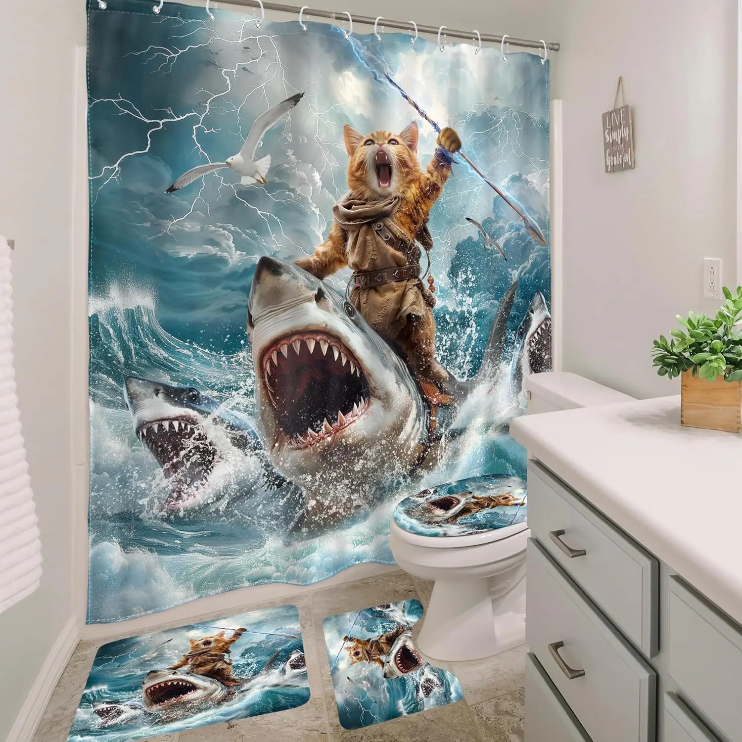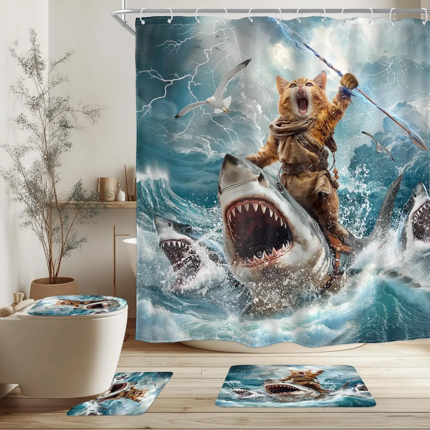 1/4 Pcs Funny Cat Shower Curtain Riding Shark Riding Shark Surfing Beach Ocean Waves 70Wx70H Inch Hilarious Fabric Decor Bathroom Rug Set Bath Mats Nonslip Washroom Decor Shower Accessories