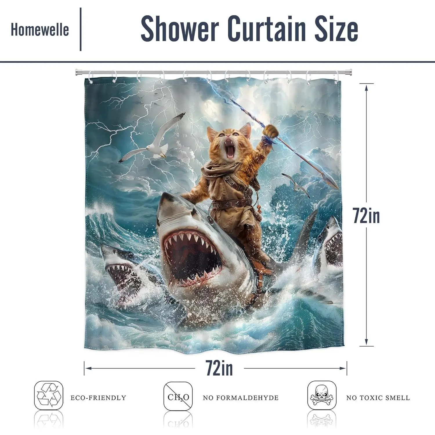 5. 1/4 Pcs Funny Cat Shower Curtain Riding Shark Riding Shark Surfing Beach Ocean Waves 70Wx70H Inch Hilarious Fabric Decor Bathroom Rug Set Bath Mats Nonslip Washroom Decor Shower Accessories