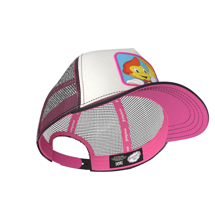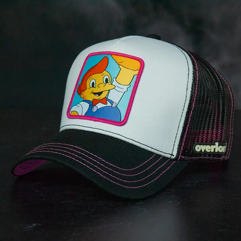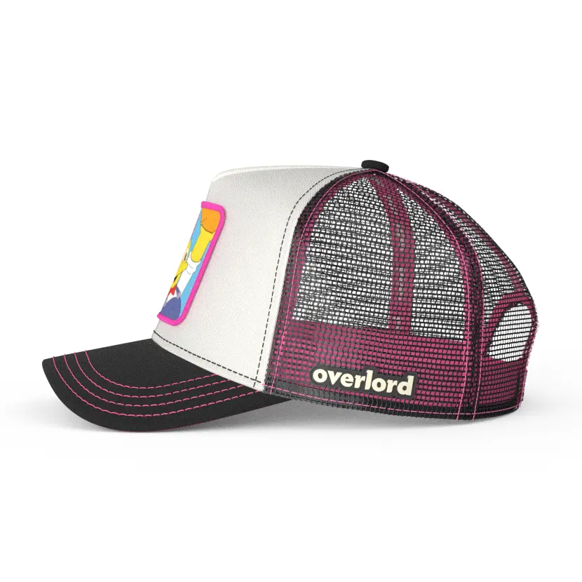 🧁 Loud, sugar-stuffed, and grinning like a mascot who knows he's the main attraction, the Overlord x The Simpsons Lard Lad Trucker Cap is a glorious tribute to Springfield’s most iconic doughboy. Built from clean white cotton twill with a black brim and pink stitching, this cap delivers all the kitsch and chaos of a 50-foot statue promising empty calories and eternal joy. The woven patch pops with Lard Lad mid-fist-pump—donut hoisted like a holy relic, eyes wide with sugary triumph. 💥🍩
