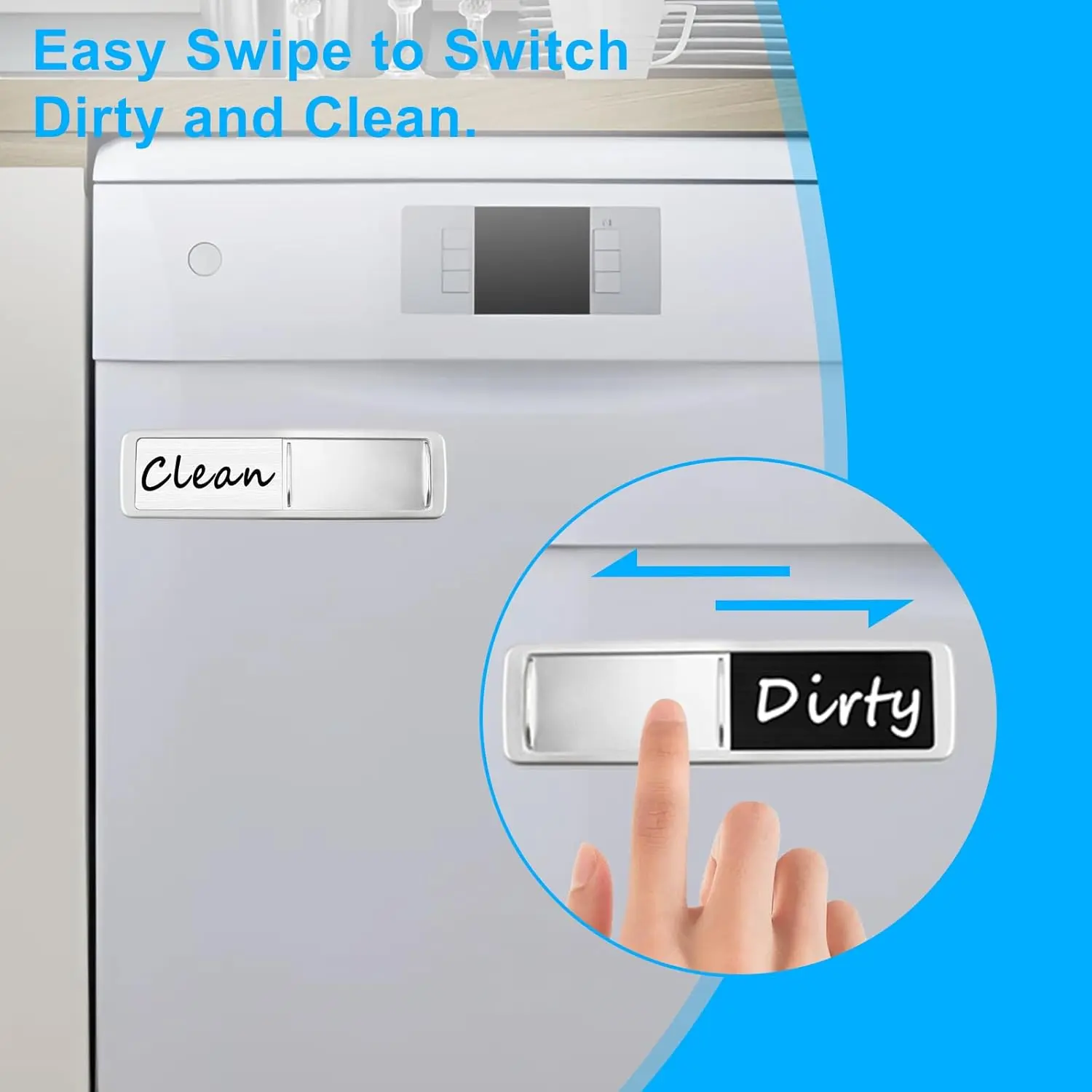 Dishwasher magnet clean and dirty sign designed to show whether dishes inside are clean or used. The sliding indicator allows users to switch between “clean” and “dirty” with a simple movement. The text is clear and easy to read from a distance, helping reduce confusion in shared spaces.