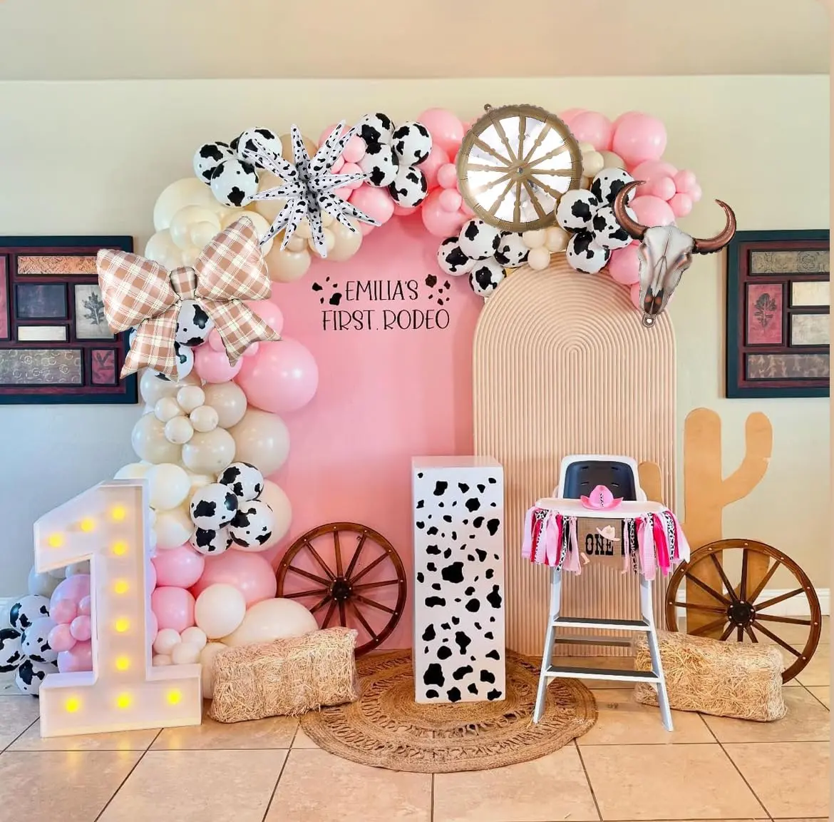Celebrate a wild west vibe with brown and pink balloons featuring cow heads, wagon wheels, and checkered bows.