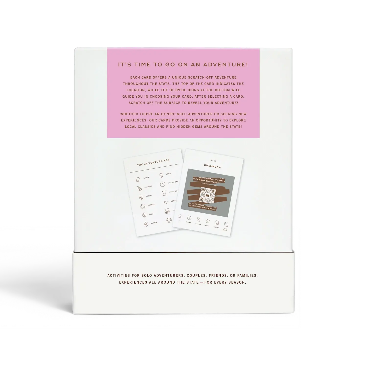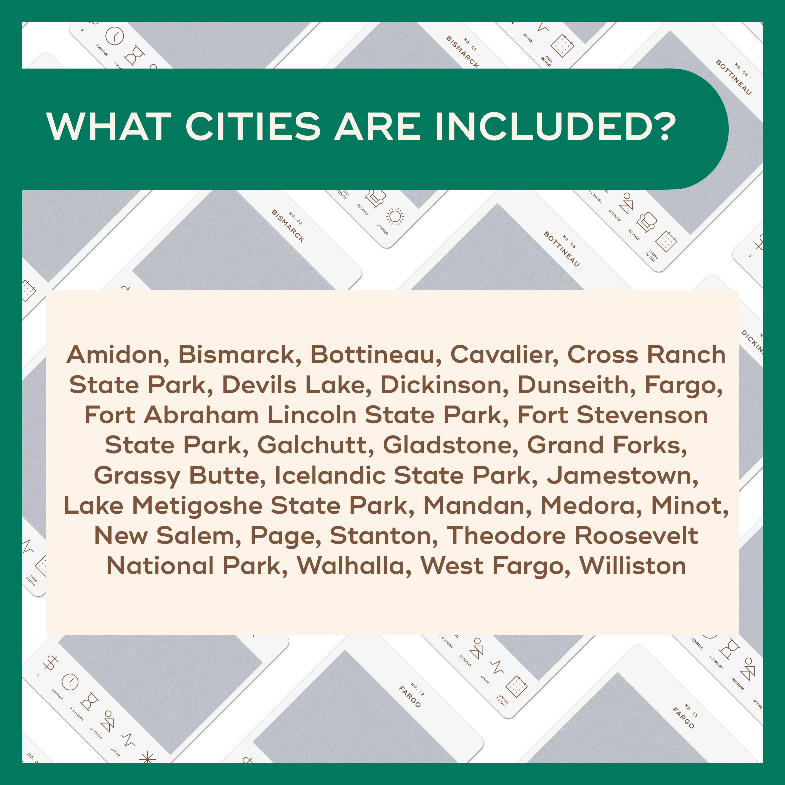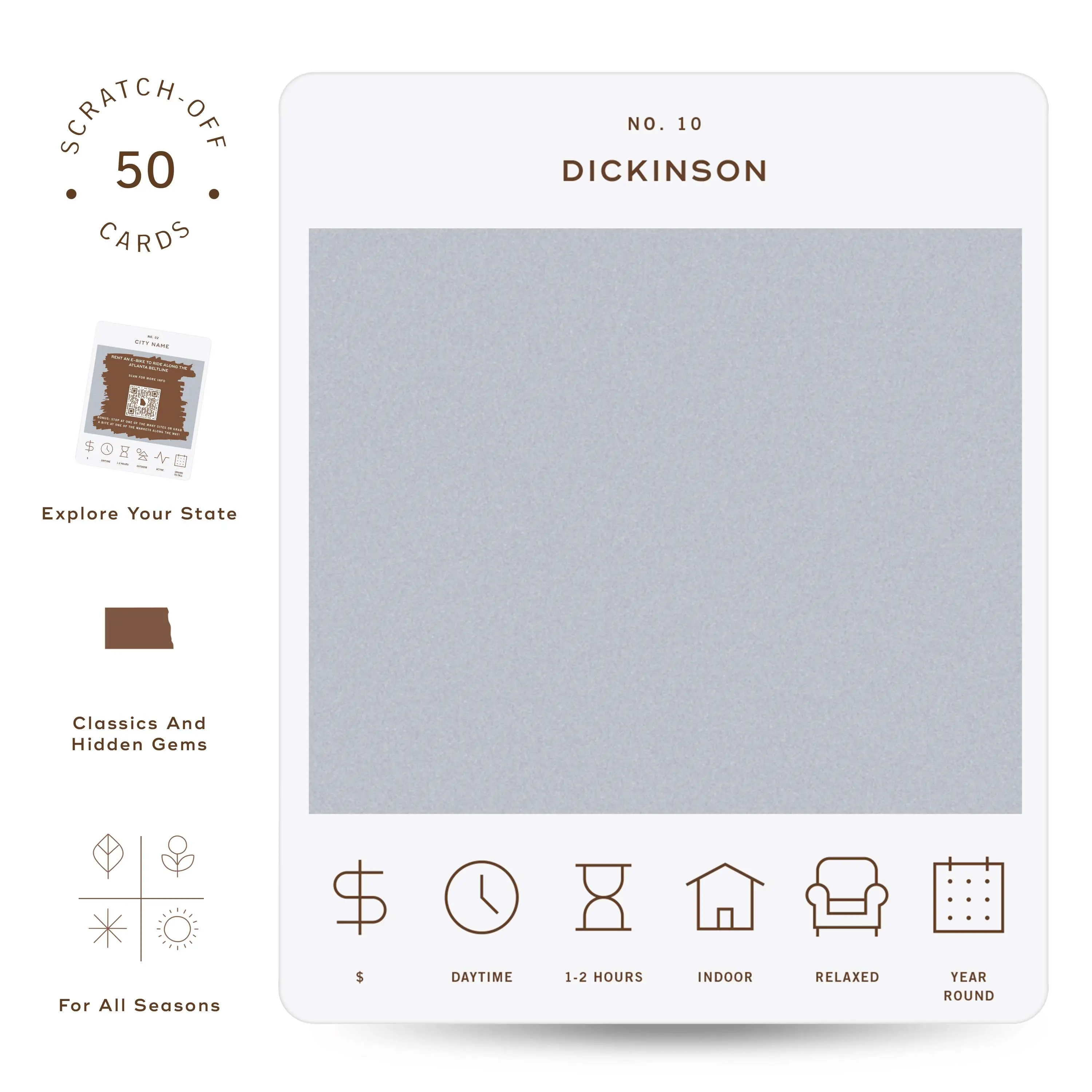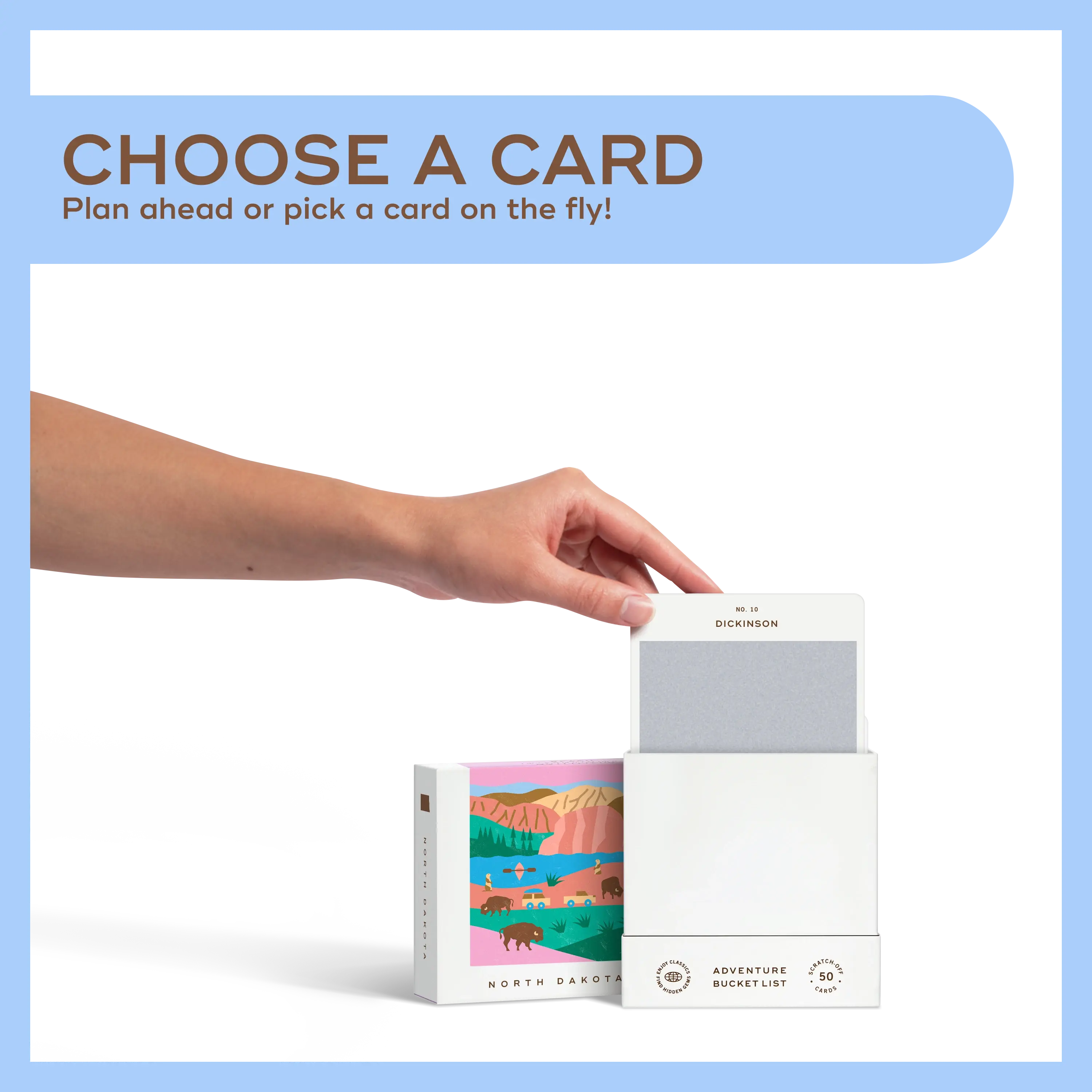 50 scratch off bucket list adventures around the state of North Dakota. Pick a city that you want to explore, check out the icons at the bottom of the card to determine the season, cost, and time of day, and then scratch off the card to reveal your adventure!