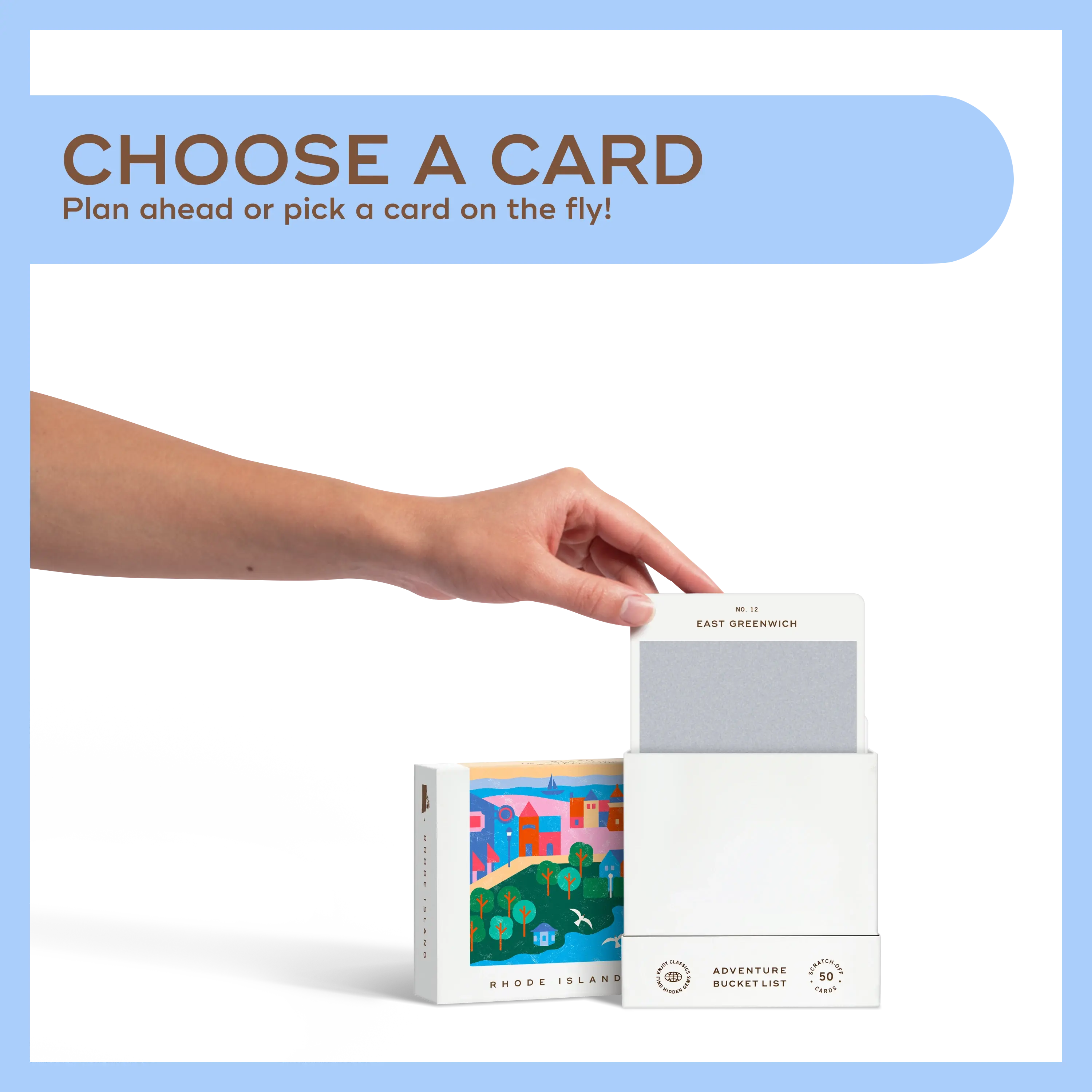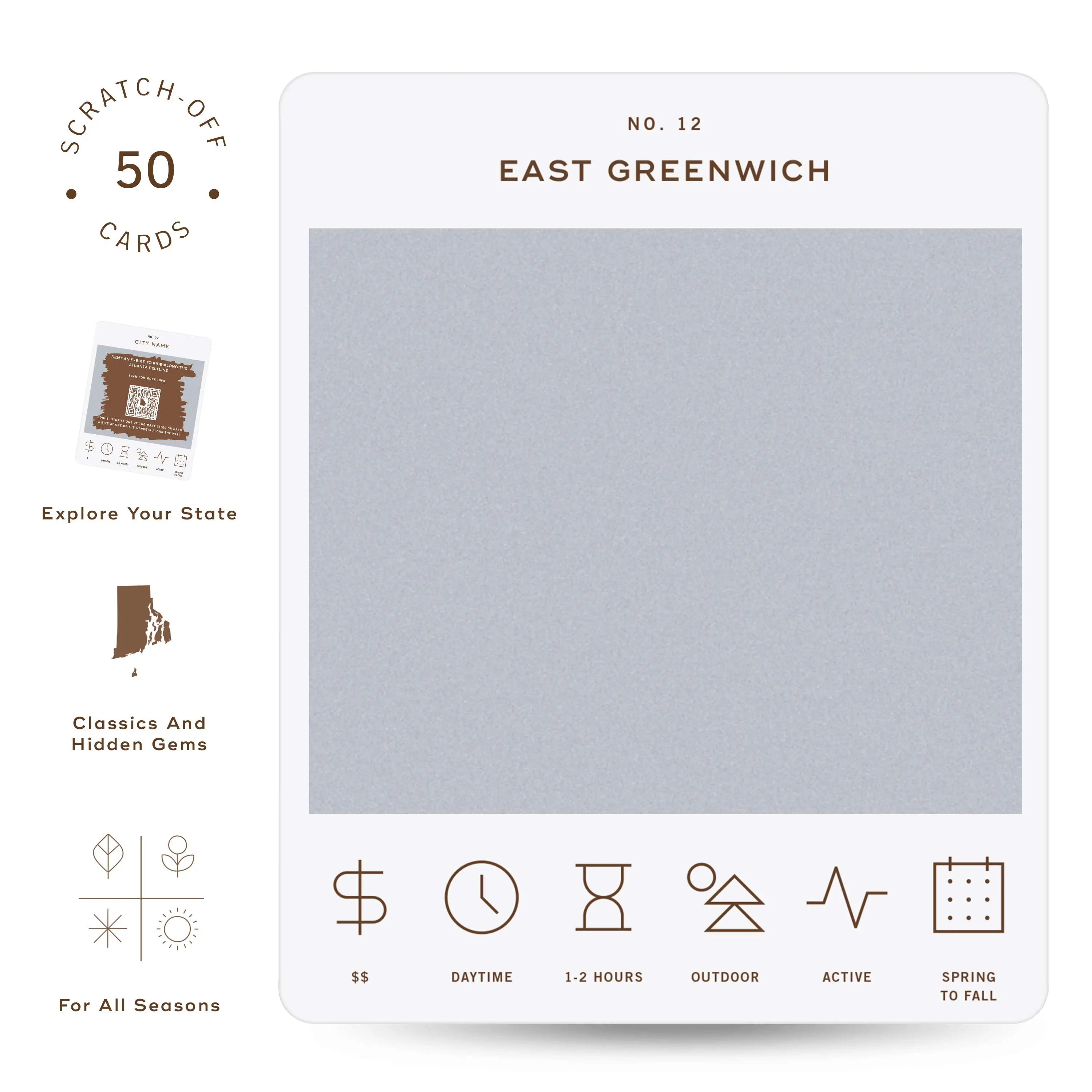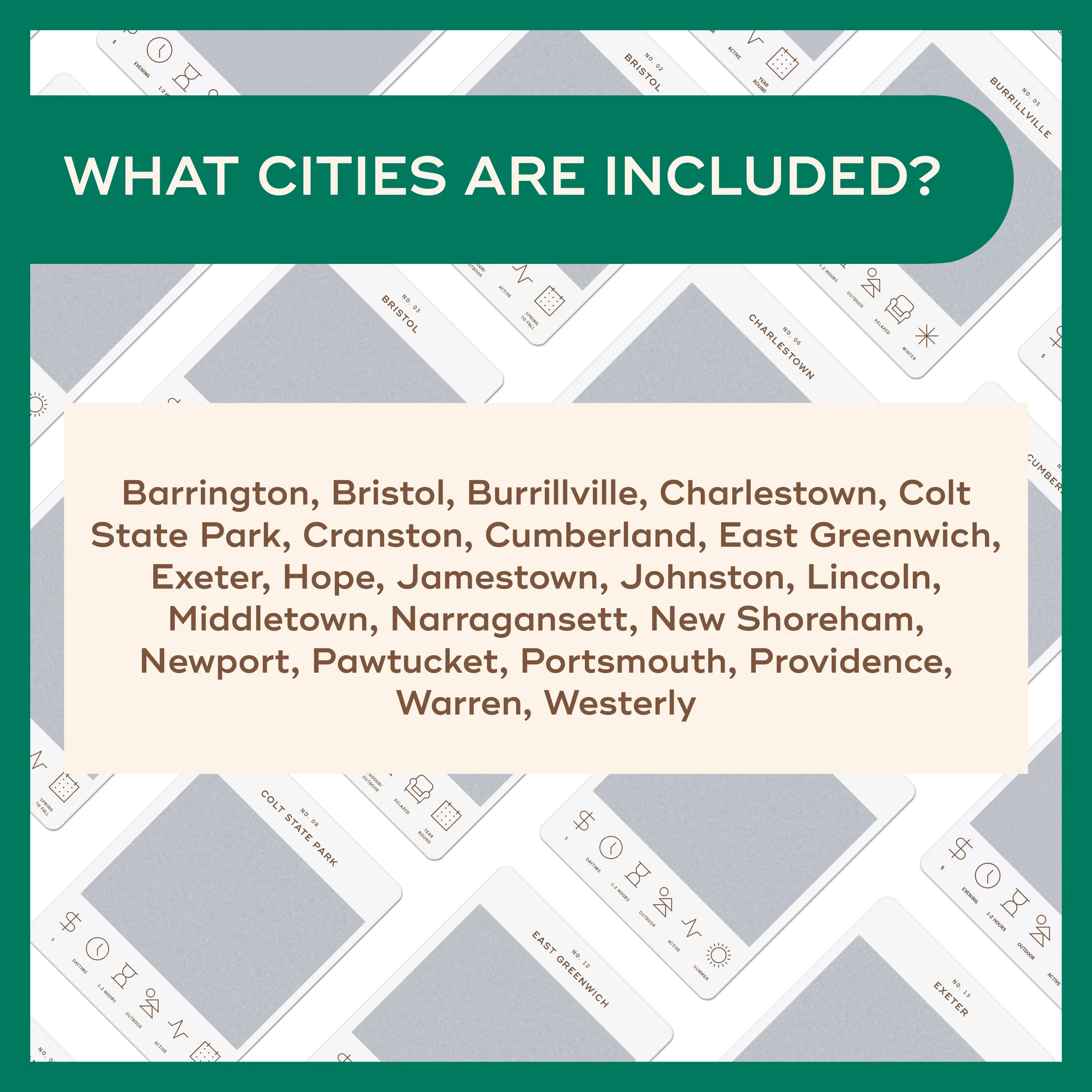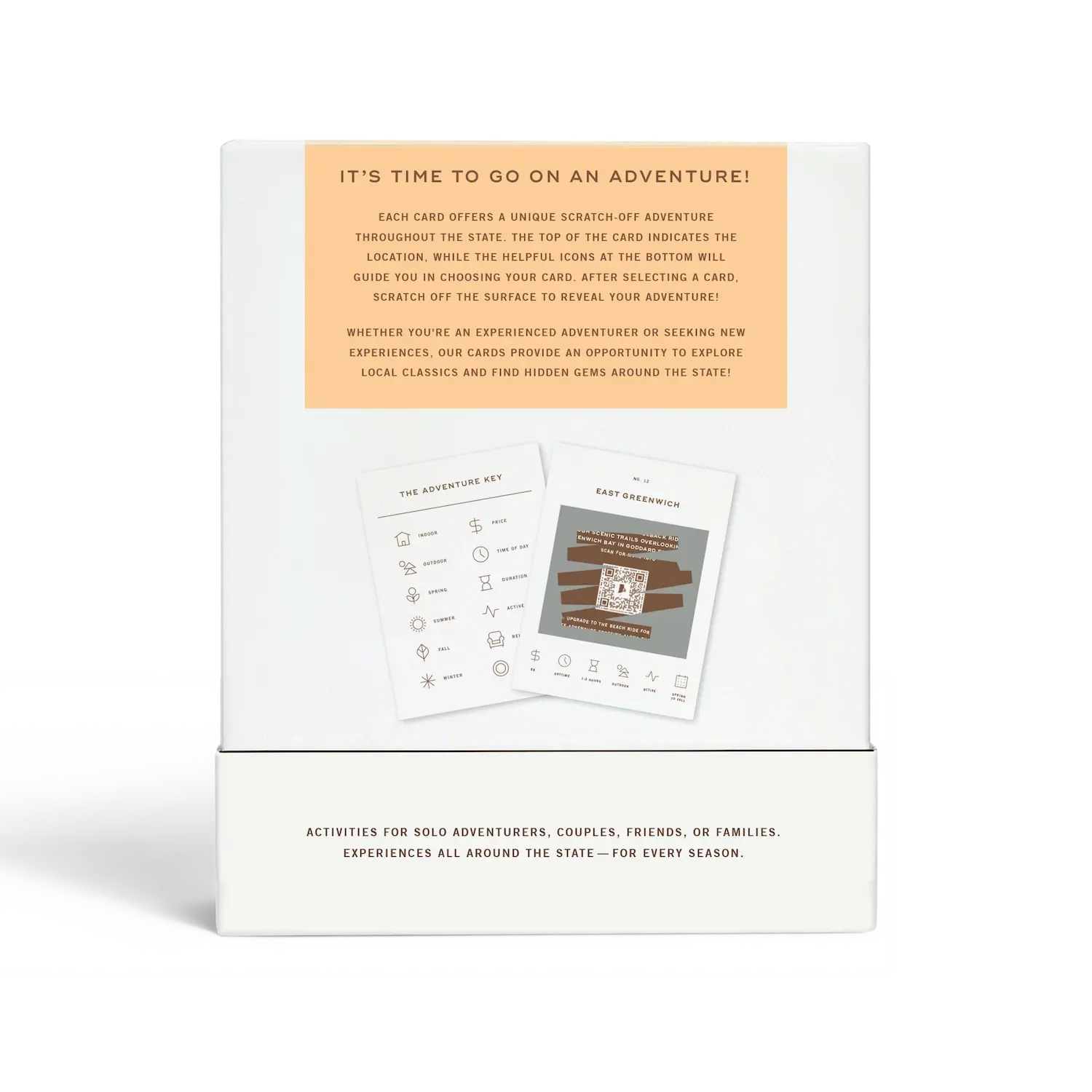 50 scratch off bucket list adventures around the state of Rhode Island. Pick a city that you want to explore, check out the icons at the bottom of the card to determine the season, cost, and time of day, and then scratch off the card to reveal your adventure!