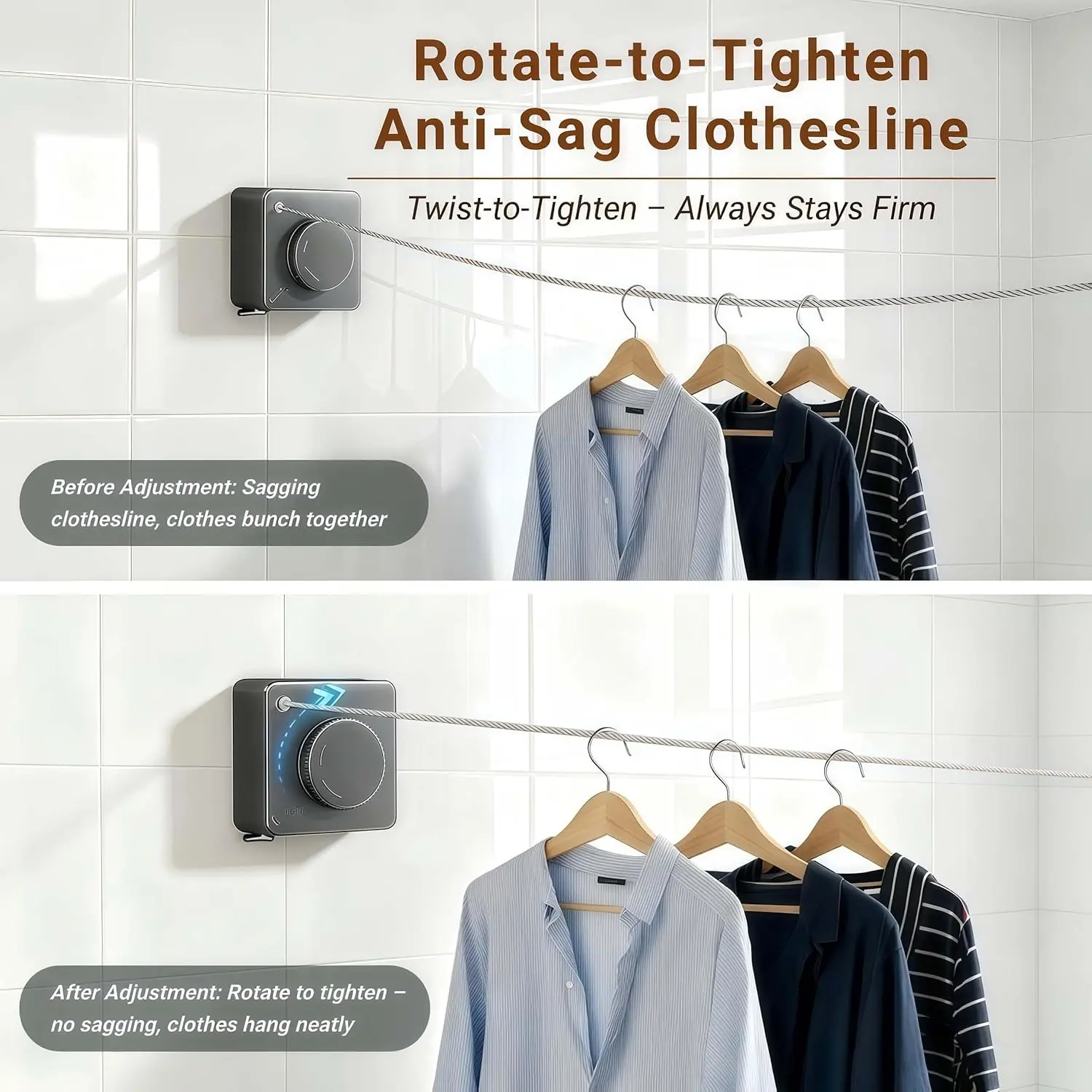 ·Heavy-Duty & Non-Drooping: Rotatable locking mechanism supports up to 40 lbs, ideal for towels, sheets, and delicate garments