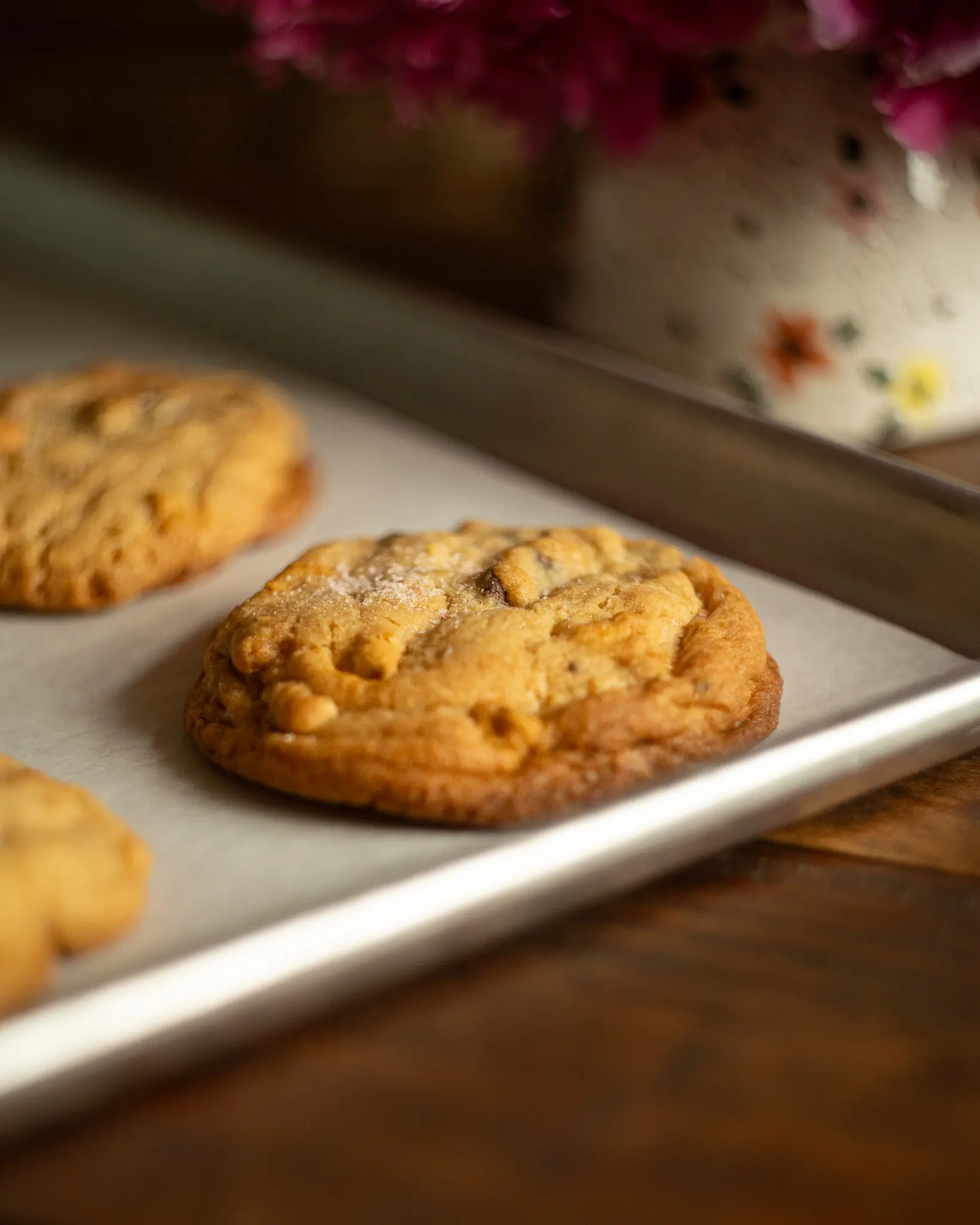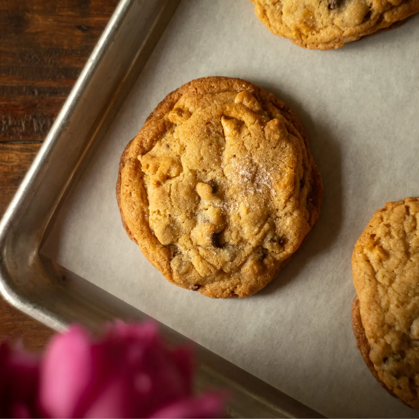 Our Chocolate chip cookies are topped with a light sprinkling of pink Himalayan sea salt that truly makes all the difference. They are full of chocolate chips, crunchy on the edges, and chewy through the thick center.