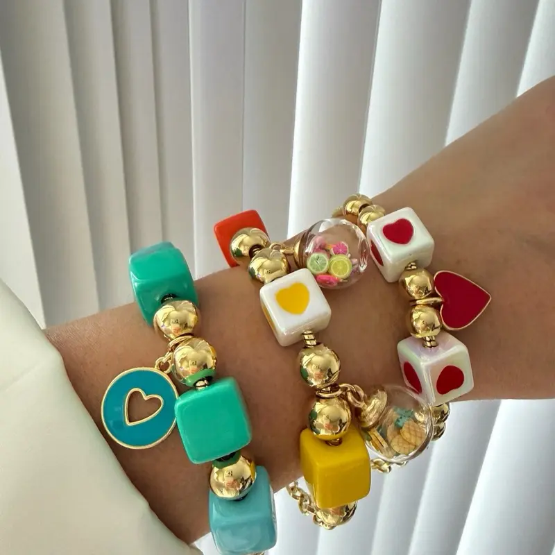 This chunky charm bracelet features vibrant beads, heart details, and gold accents for a bold, trendy look 🌈