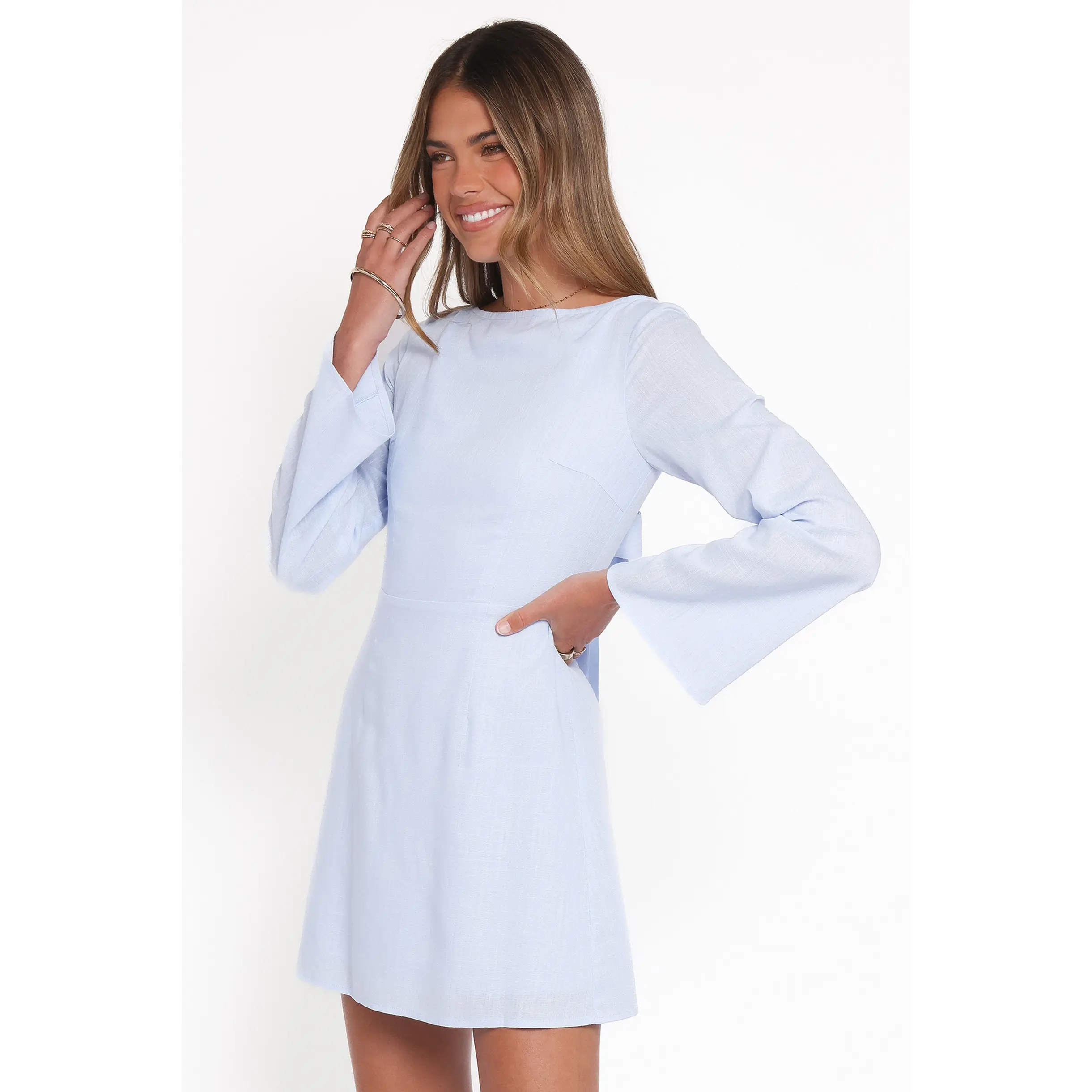 This stunning mini features a classic boat neckline and dramatic long flare sleeves for a look that's both timeless and on-trend. A daring back cut-out with a delicate tie closure adds an unexpected twist, ensuring you make an entrance and an exit.
