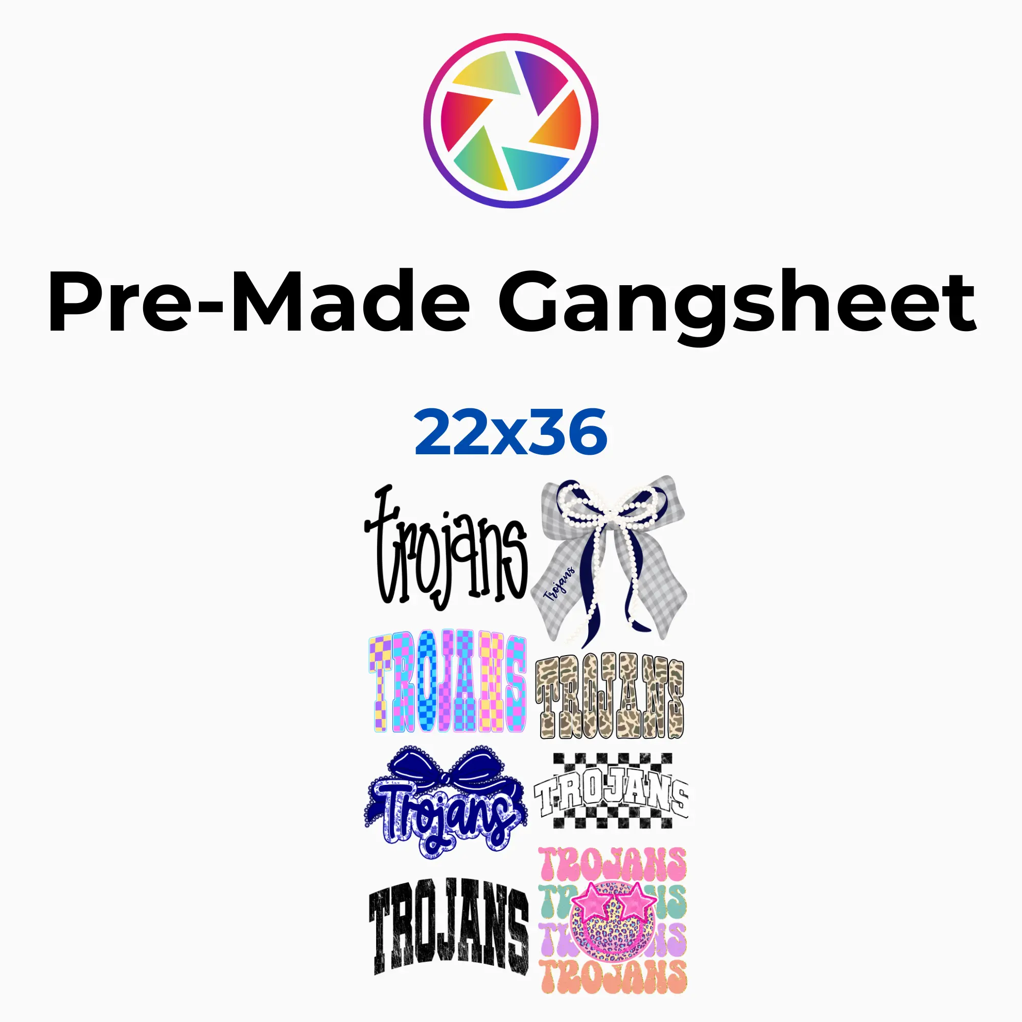 This sheet features multiple Trojan-inspired designs with a mix of bold lettering, checkered patterns, and coquette-style bows for a trendy, modern game day look. All designs are laid out and ready to press so you can maximize your prints and profits with ease.