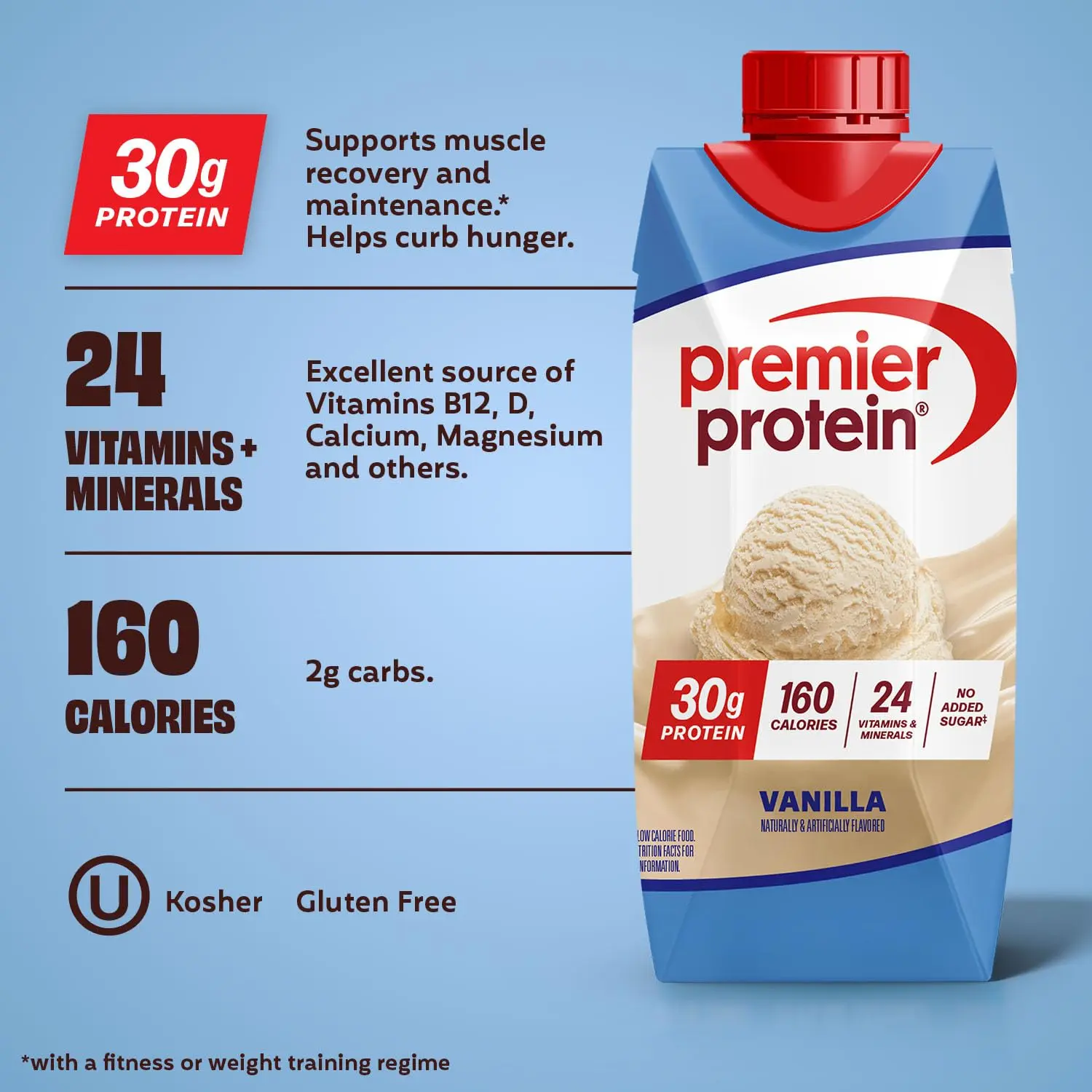 ·Each Premier Protein Shake contains 30g of protein, complete with all the essential amino acids, 1g of sugar, 3–5g of carbs (depending on flavor), 160 calories, 24 vitamins and minerals, and is also low in fat. We use a blend of milk protein concentrate and calcium caseinate to help support your fitness goals. Enjoy a shake as a healthy snack, a breakfast on the go, or as post or pre-workout fuel. They are delicious as is but also highly customizable. Blend with your favorite fruits and vegetables in a smoothie, pour over cereal or oatmeal, or use as a base for proffee (protein coffee) or protein ice cream. Available in 12 core flavors: Bananas & Cream, Cake Batter Delight, Cafe Latte, Caramel, Chocolate, Chocolate Peanut Butter, Cinnamon Roll, Cookie Dough, Cookies & Cream, Peaches & Cream, Strawberries & Cream, and Vanilla. (Seasonal flavors also available for a limited time.)