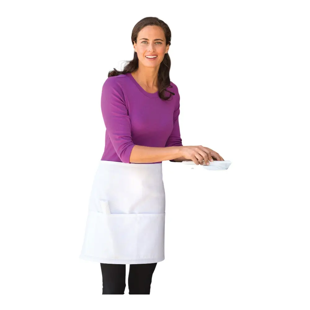 This half bistro apron is crafted from a durable poly/cotton twill blend with stain-release protection, making it perfect for both restaurant and home use. It features two front pockets with pen pockets for convenience and easy access to essentials. Its 27"w x 18"l size offers the right amount of coverage for everyday tasks.