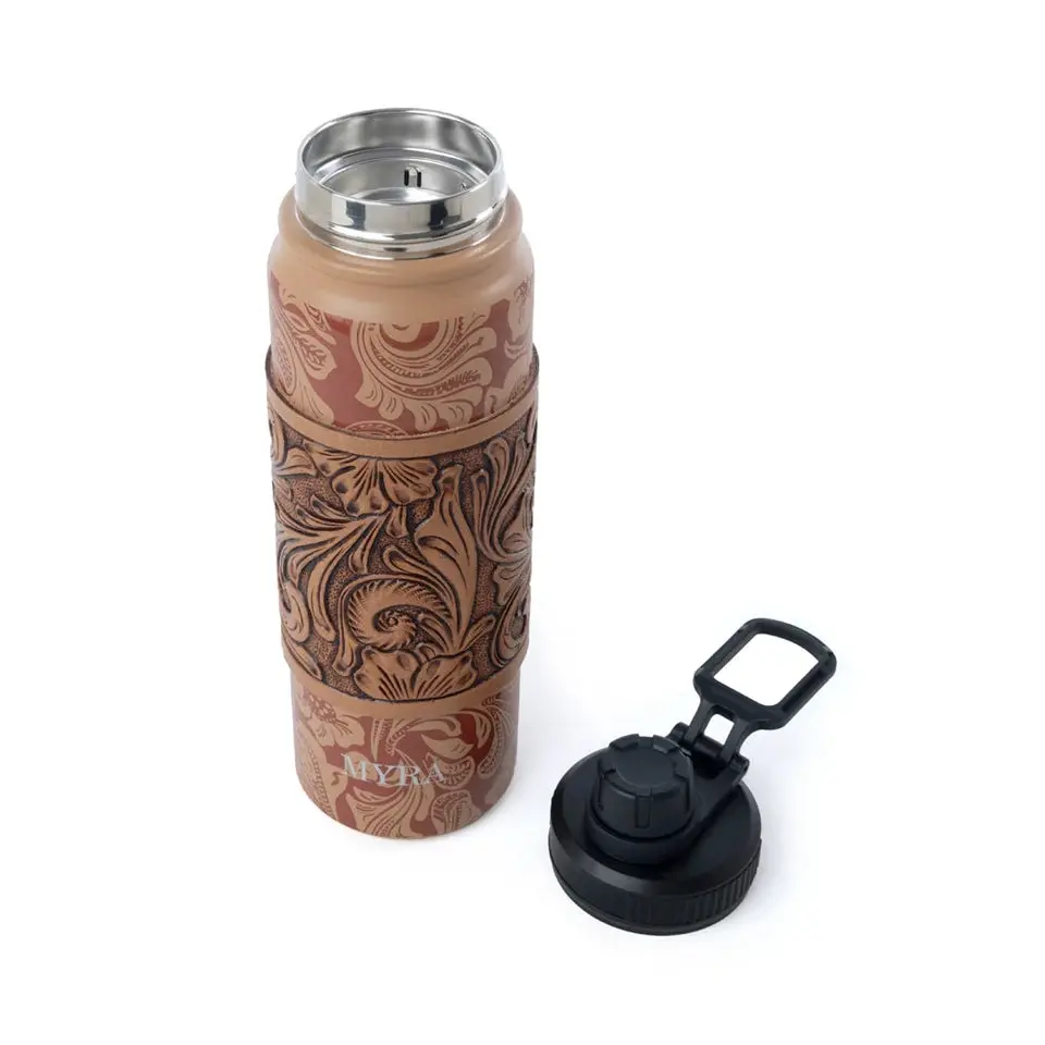 Reach those daily water goals in style with this beautiful tooled brown, stainless steel tumbler with a removable leather tooled wrap. Hydration will be a new statement!