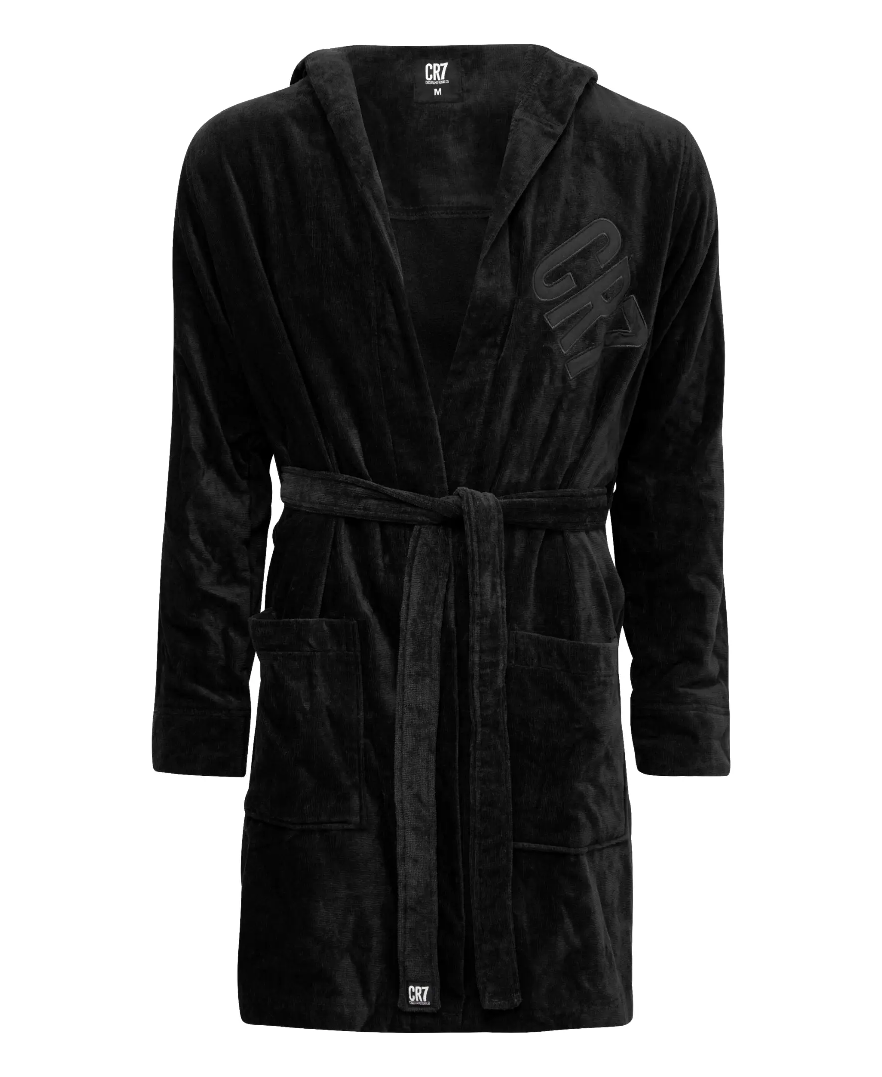 CR7 Men's plush 100% terry cotton bathrobes. This long sleeve, 2-pocket medium weight robe typically sits mid-thigh. Sleeve width is designed with a slight contour for a modern, athletic cut. Robe features 'CR7' logo on left chest and is machine washable.