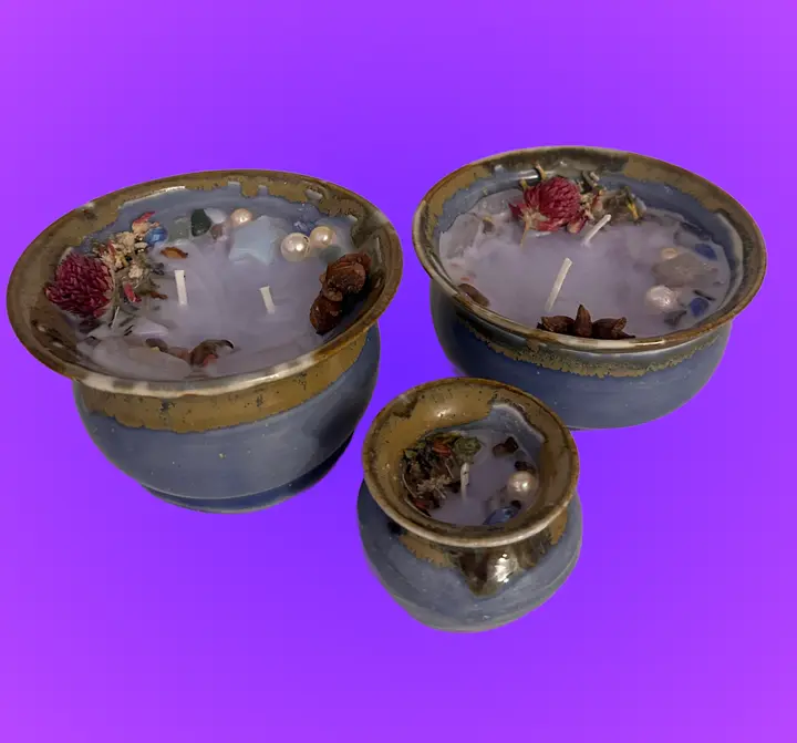 made with soy and beeswax blend, semi precious crystals, patchouli/lavender essential oils, peppermint, lavender, rosemary, globe amaranth, star anise, lotus plumule, and slippery elm bark
