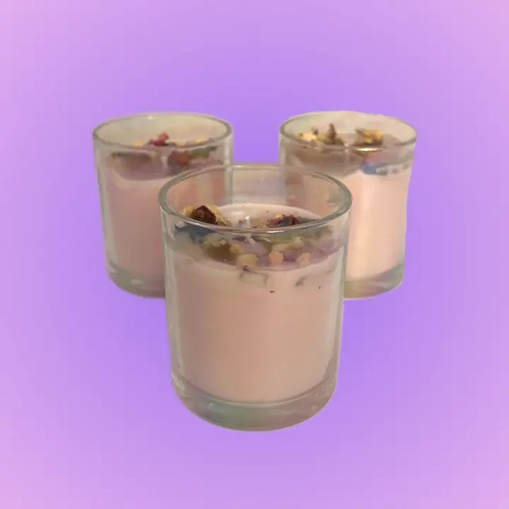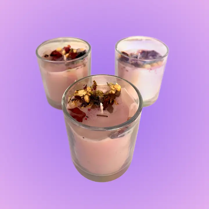 Handmade soy/beeswax blend candles with geranium essential oils, jasmine, lavender, rose buds, semi-precious crystals, and amethyst sand