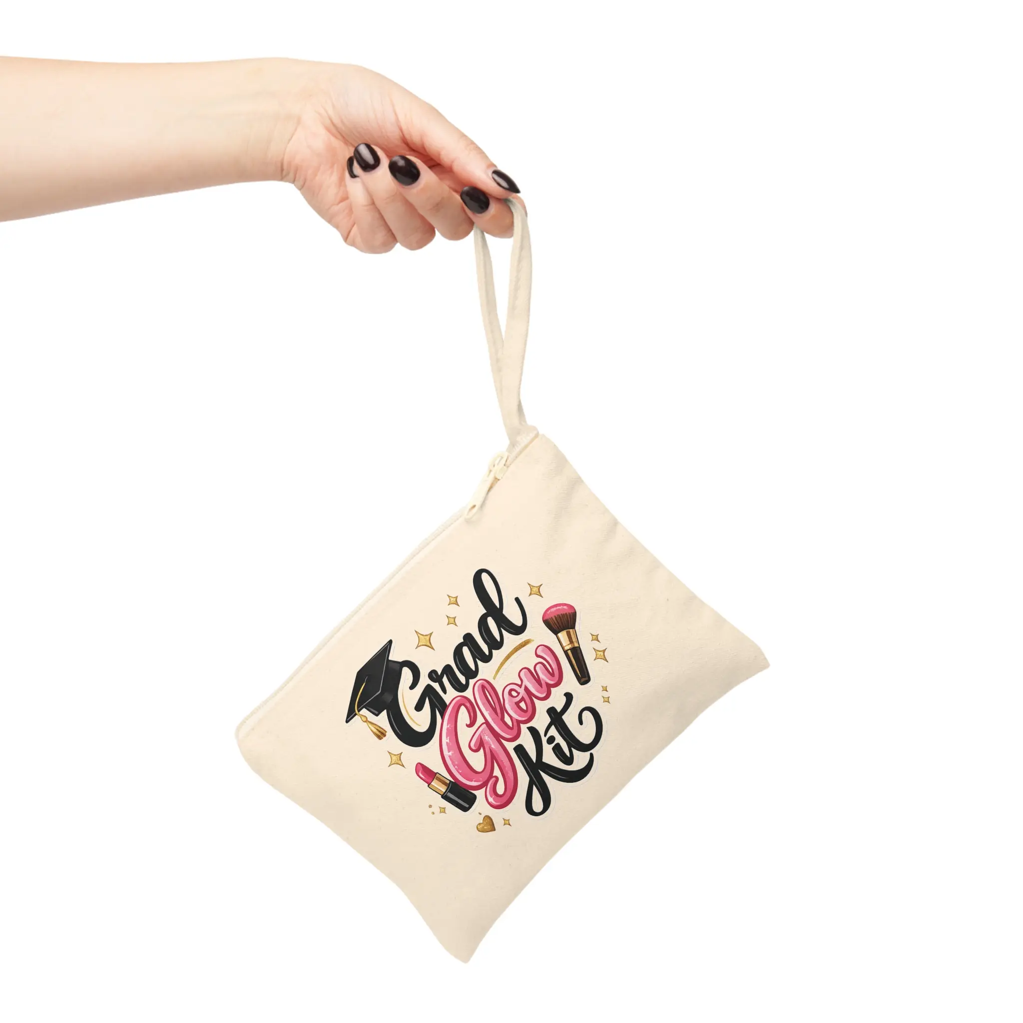 A cheerful, canvas zipper pouch made to tuck a few beauty essentials into a graduation day kit. The natural cream canvas and matching zipper let the colorful “Grad Glow Kit” artwork—complete with a graduation cap, lipstick, brush, and gold sparkles—stand out. Lightweight but sturdy, the small wrist strap keeps it within reach while you move between celebrations. It’s the kind of little carryall that lives in a tote for touch-ups, photo-ready moments, and the scattered chaos of party prep.
