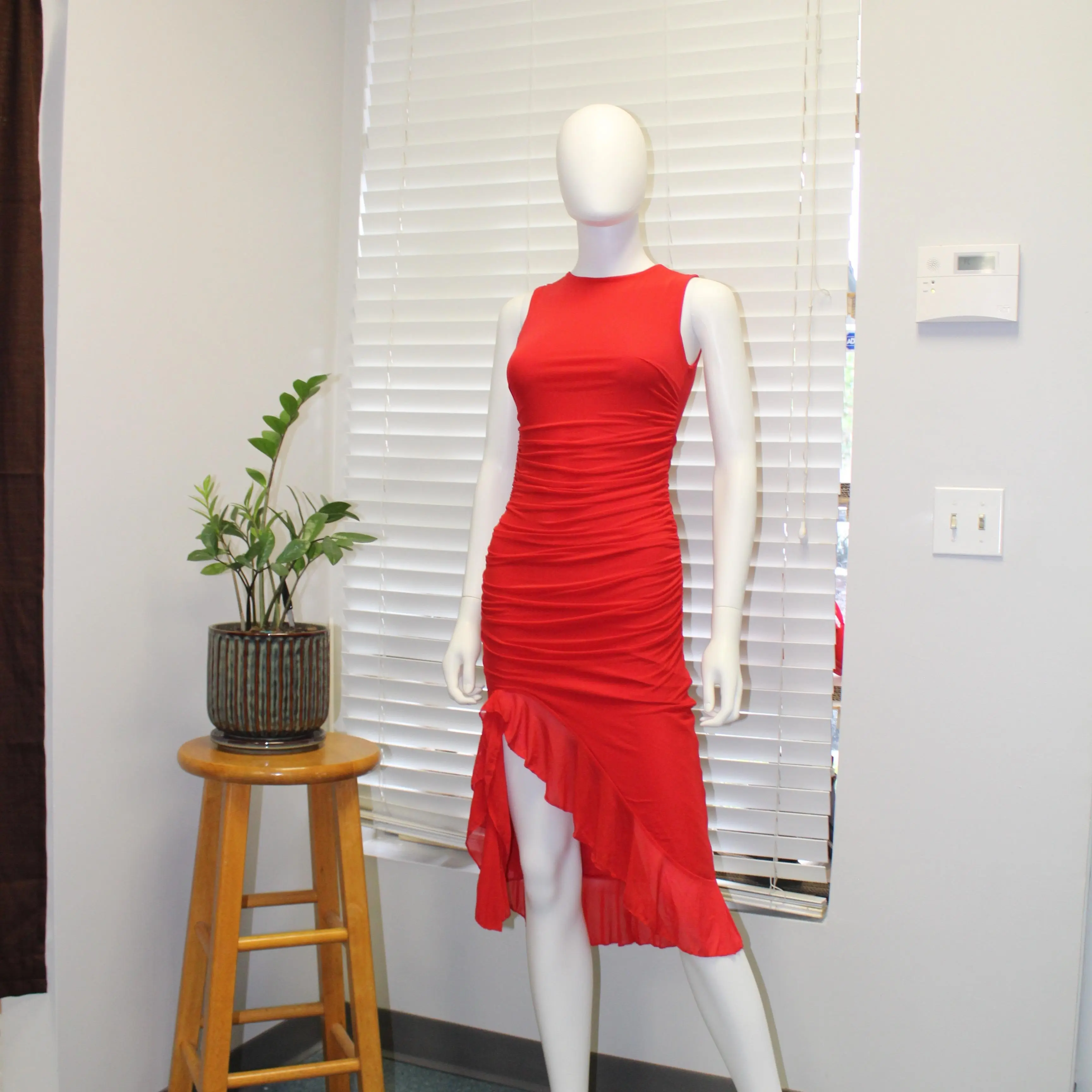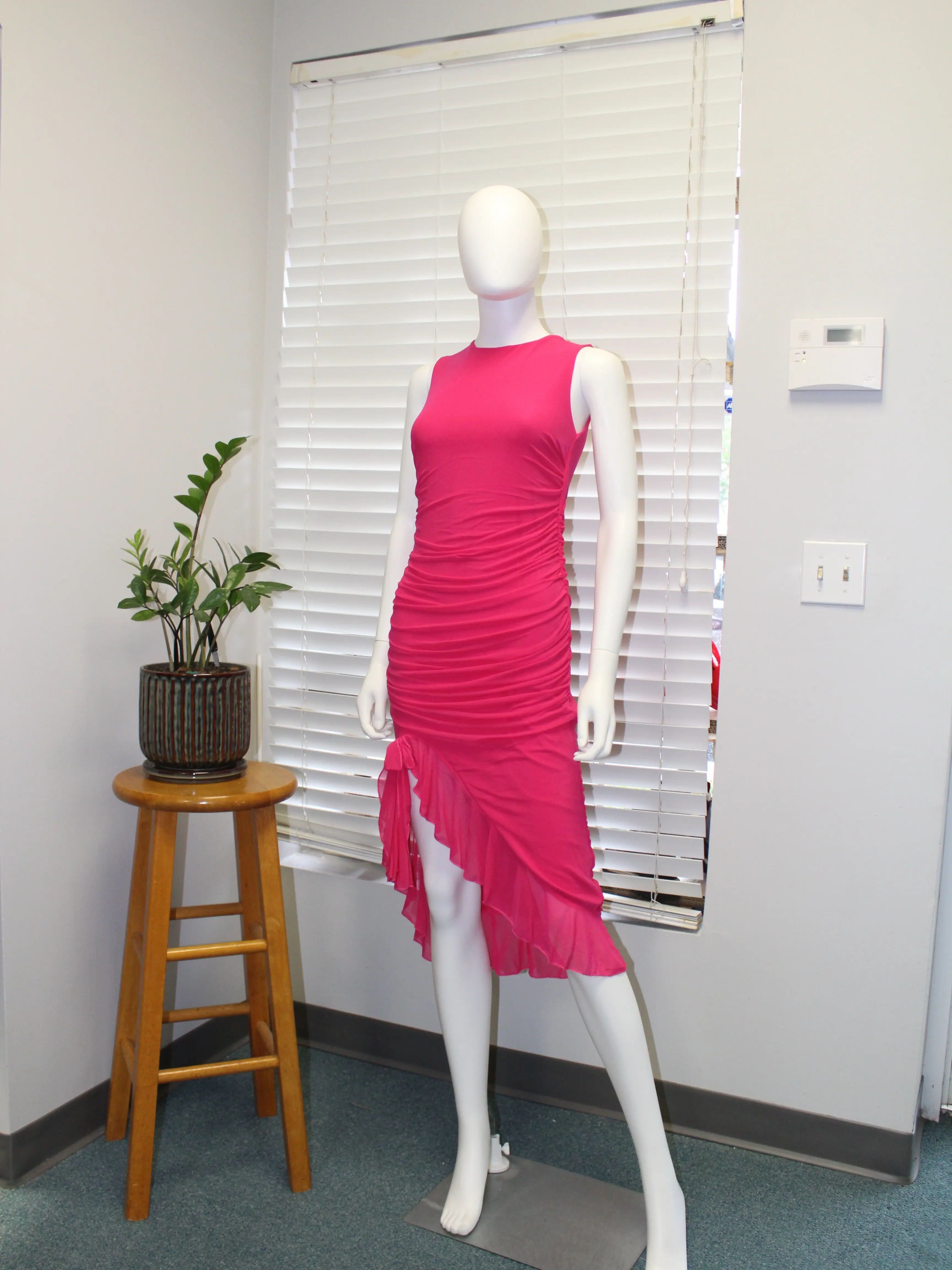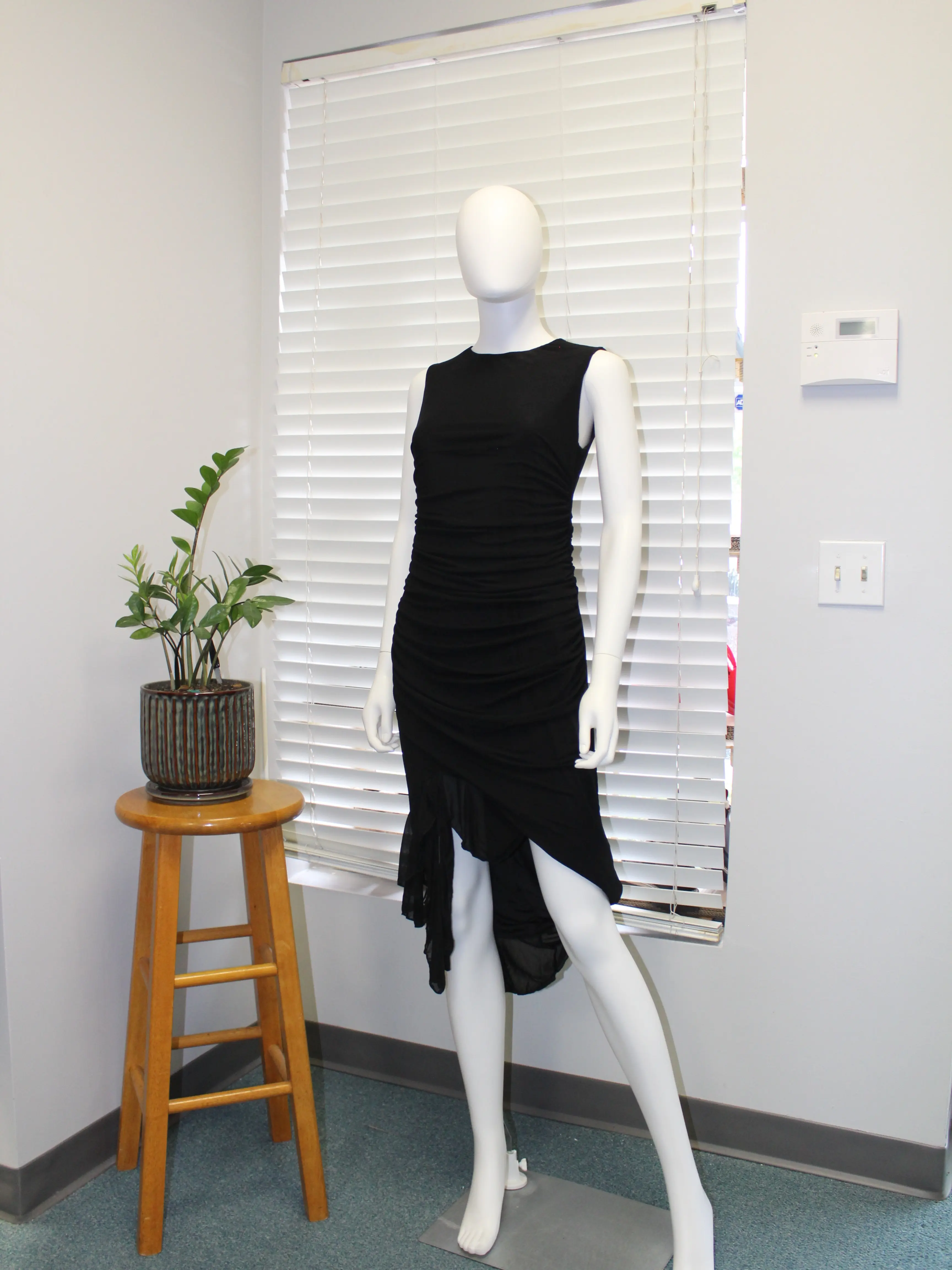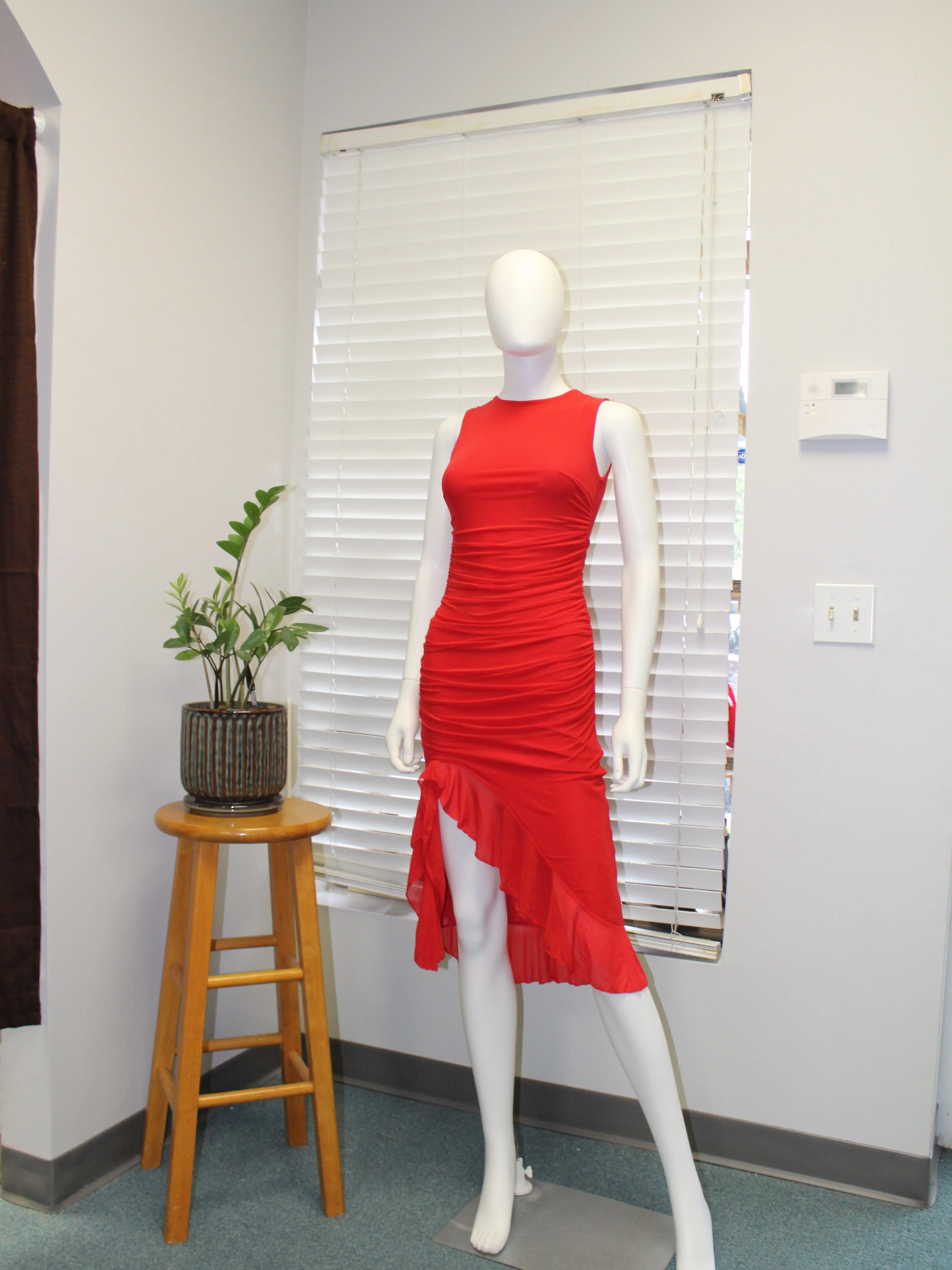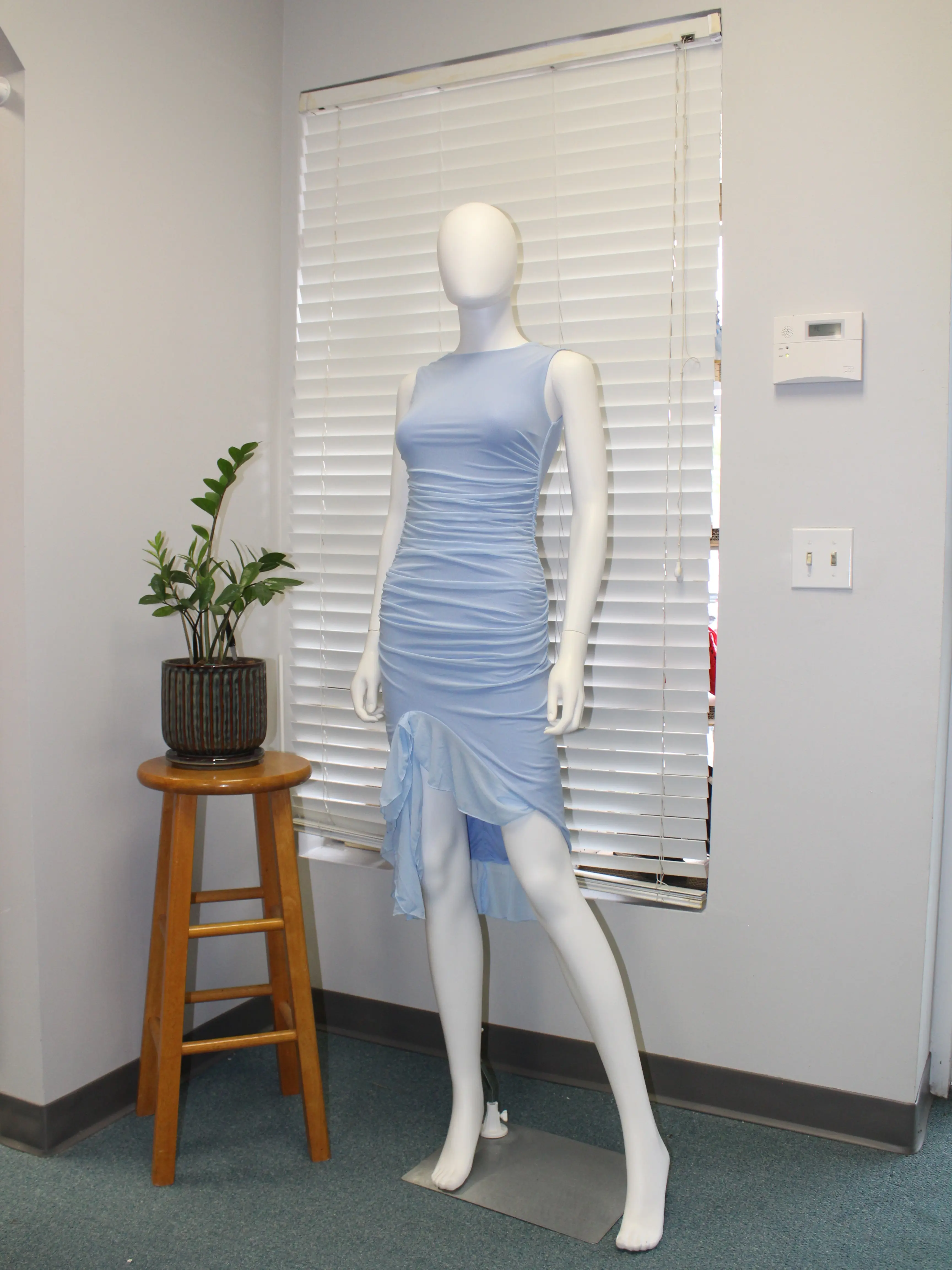 ·Asymmetrical ruffled high-low hem with side slit for movement and style