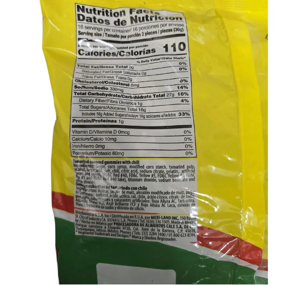 Sugar, corn syrup, modified corn starch, tamarind pulp, sorbitol, lactic acid, salt, chili, citric acid, sodium citrate, gelatin, artificial flavors and colors (FD&C Red 40, FD&C Yellow 5, FD&C Yellow 6, FD&C Blue 1, Red 40 Lake), titanium dioxide, sodium benzoate, silicon dioxide.