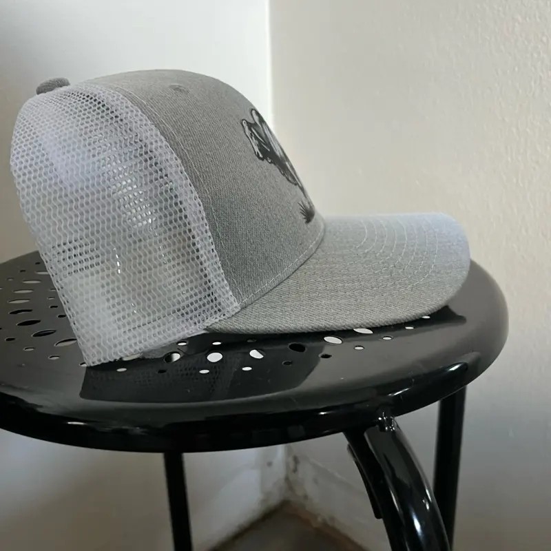 Gray and white cap with black bull print, adjustable fit