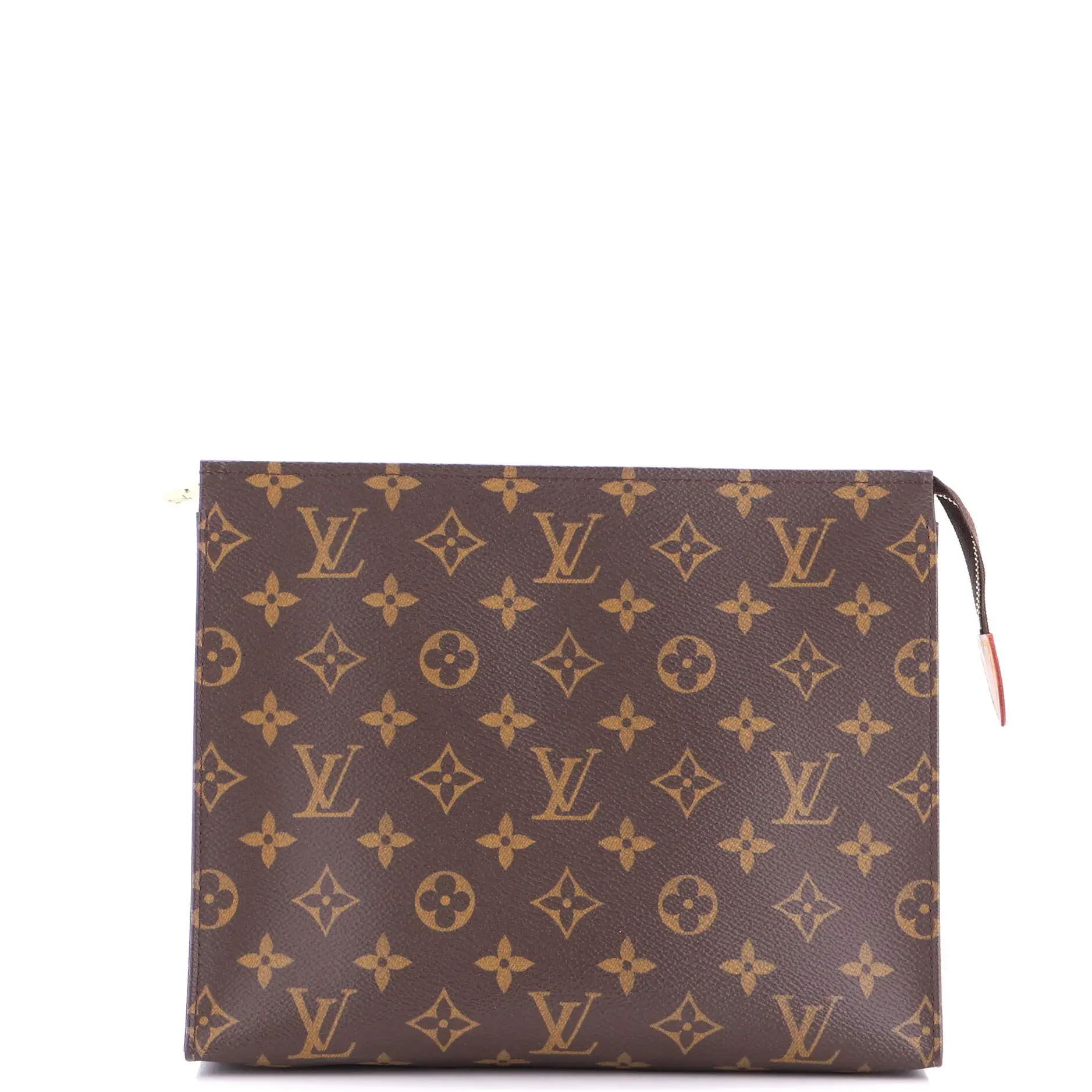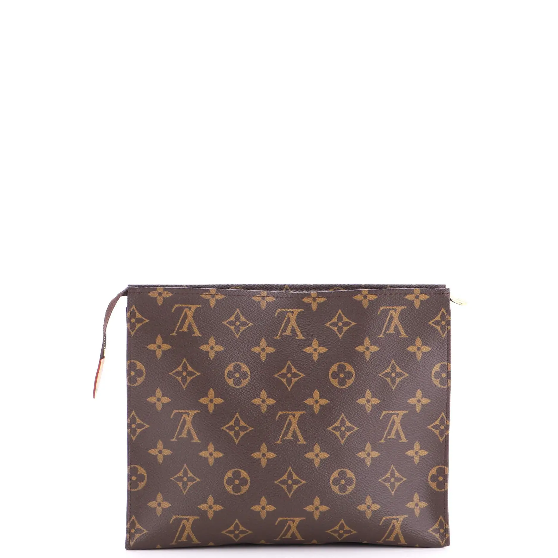 These are professional pictures of the actual item offered by Rebag. Condition: Very good. Exterior: creases, edge wear, corner wear, discoloration, minor scuffs | Interior: scuffs, perfume odor, minor discoloration | Hardware: scratches Accessories: No Accessories Measurements: Handle Drop None", Height 8", Width 9", Depth 2", Strap Drop None" Designer: Louis Vuitton Model: Toiletry Pouch Monogram Canvas 26 Exterior Material: Canvas Coated Exterior Color: Brown Interior Material: Leather Interior Color: Neutral Hardware Color: Gold Brand Code: UB4109 Item Number: 398816/1