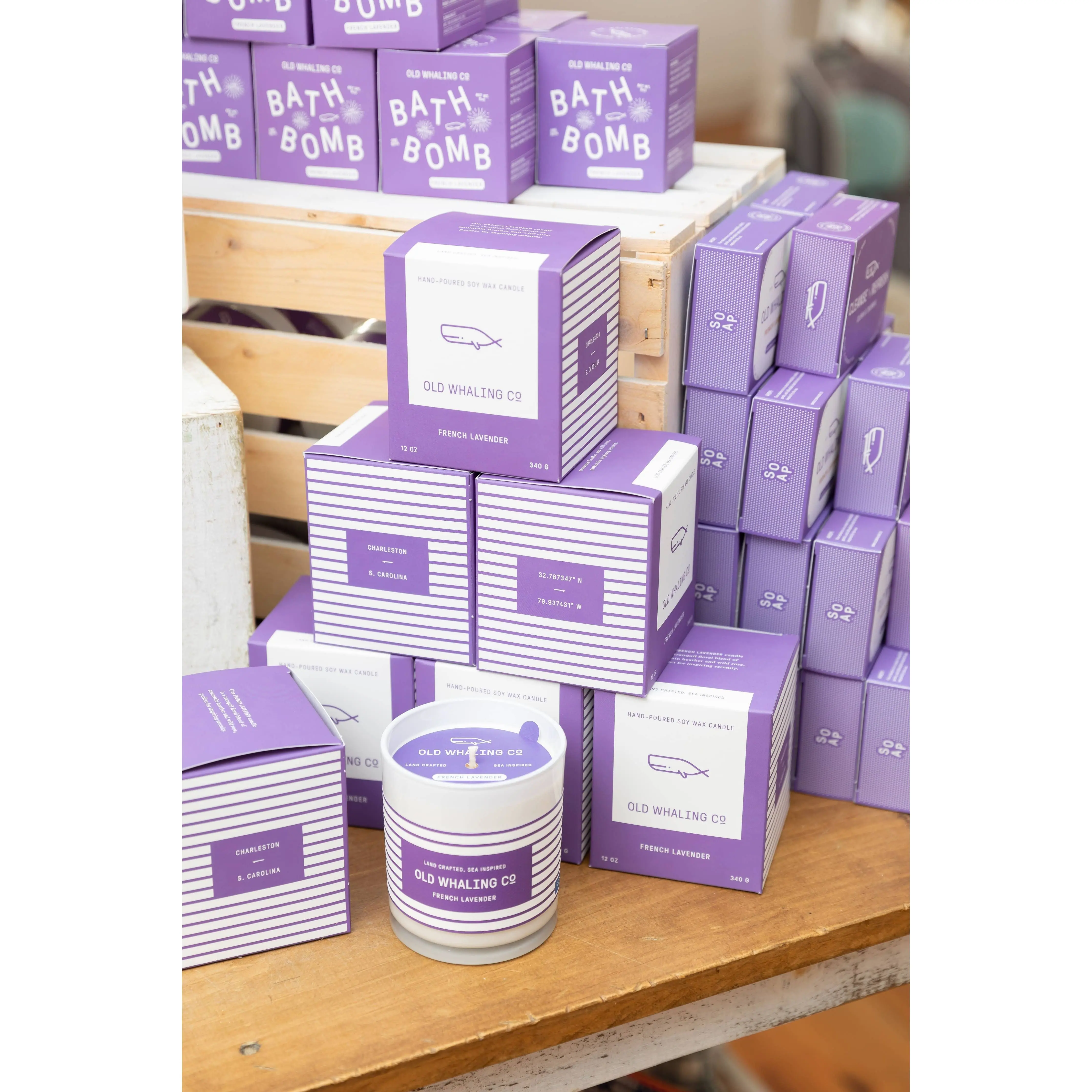 **NEW! Our new 12oz candles are hand-poured in historic Charleston, SC, and feature a lead-free cotton wick and an opaque white glass tumbler with a nautical-striped label design. Each come individually boxed.