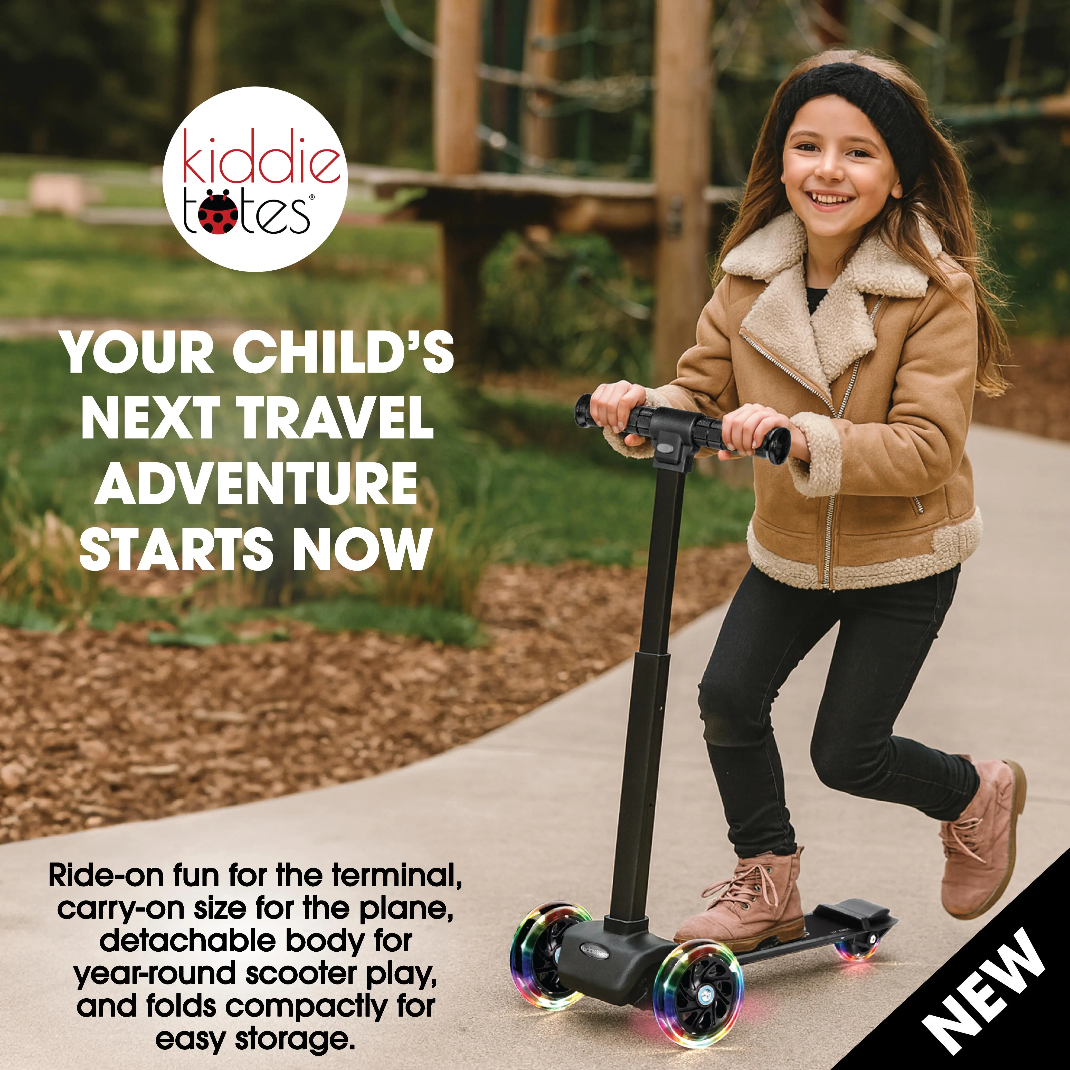 ·KID-SAFE FOLDING SYSTEM – Easy for adults to fold, yet secure for little hands. Two-button locking handlebars and flush components ensure a safe and compact carry-on scooter.