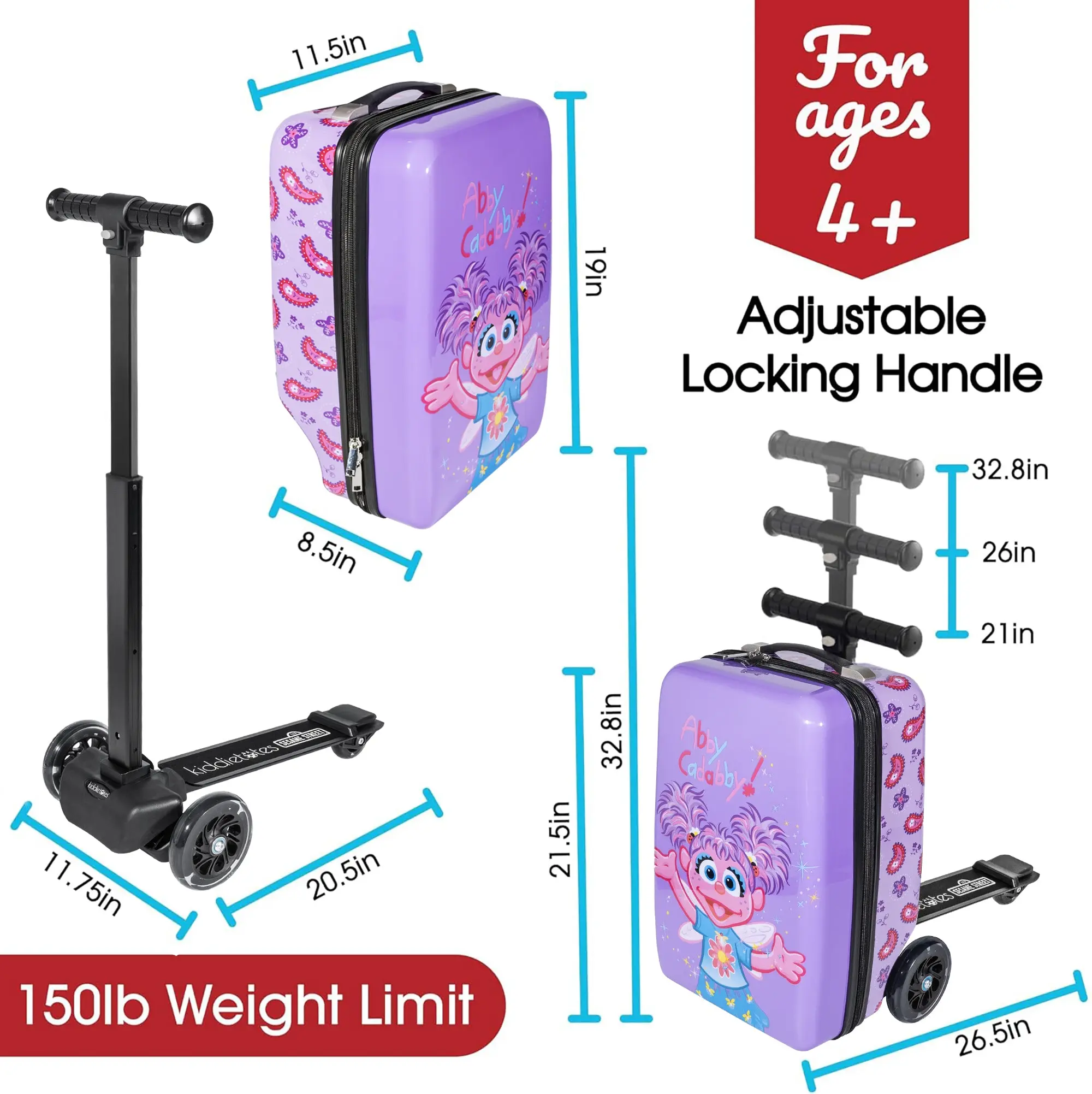 ·GROWS WITH YOUR CHILD – Adjustable handlebar with three height levels and durable grips make this scooter suitcase perfect for kids of various ages and heights. For Ages 4+. 150 lb rider weight capacity.