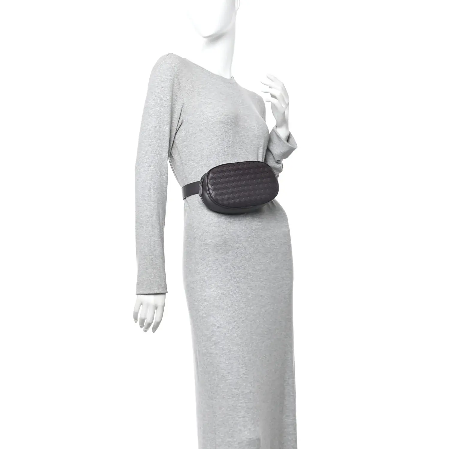 This is an authentic BOTTEGA VENETA Nappa Intrecciato Belt Bag in Aubergine. This stylish belt bag is crafted of soft lambskin intrecciato leather in dark purple. The bag features a matching waist belt with a brass buckle. The top zipper opens to a beige suede interior.
