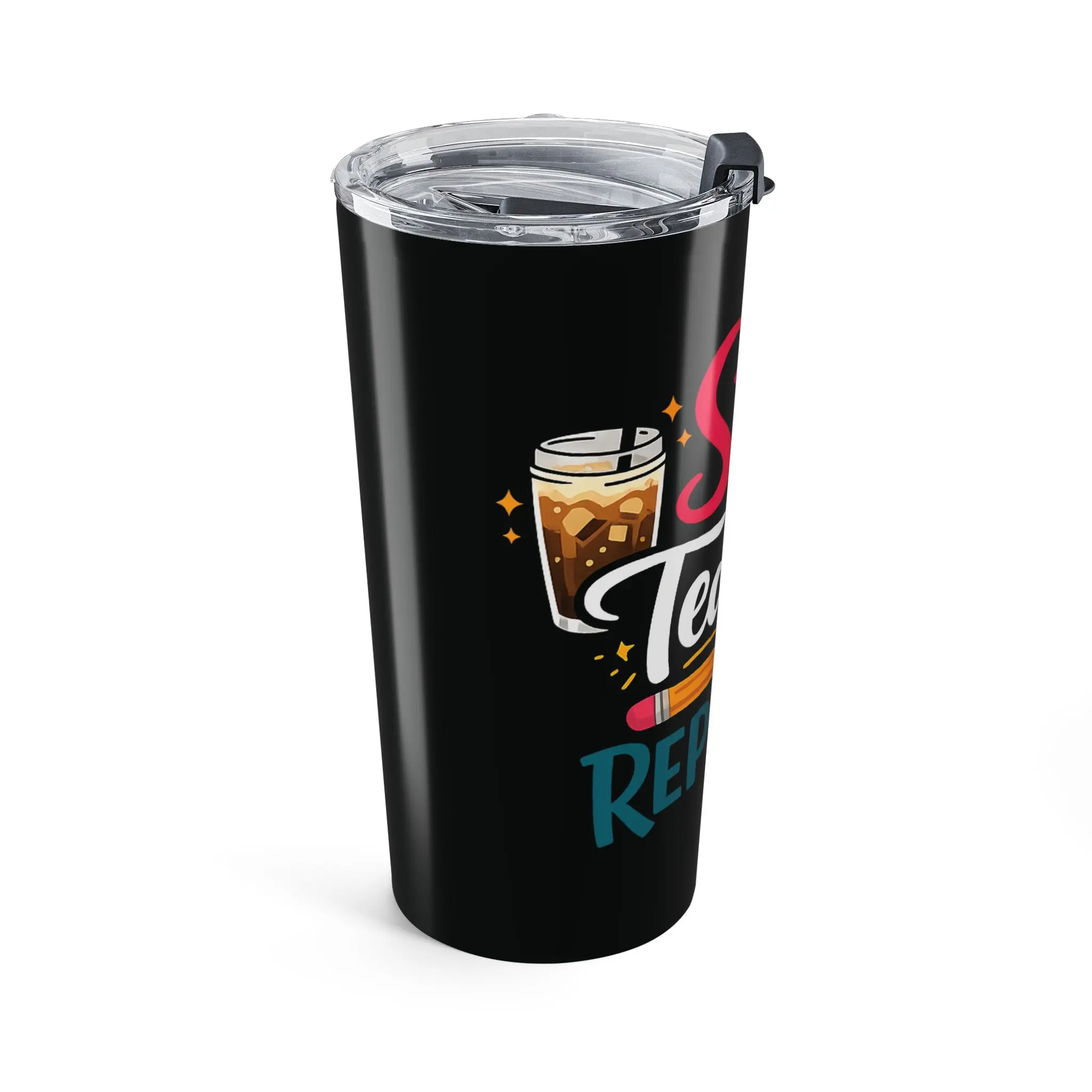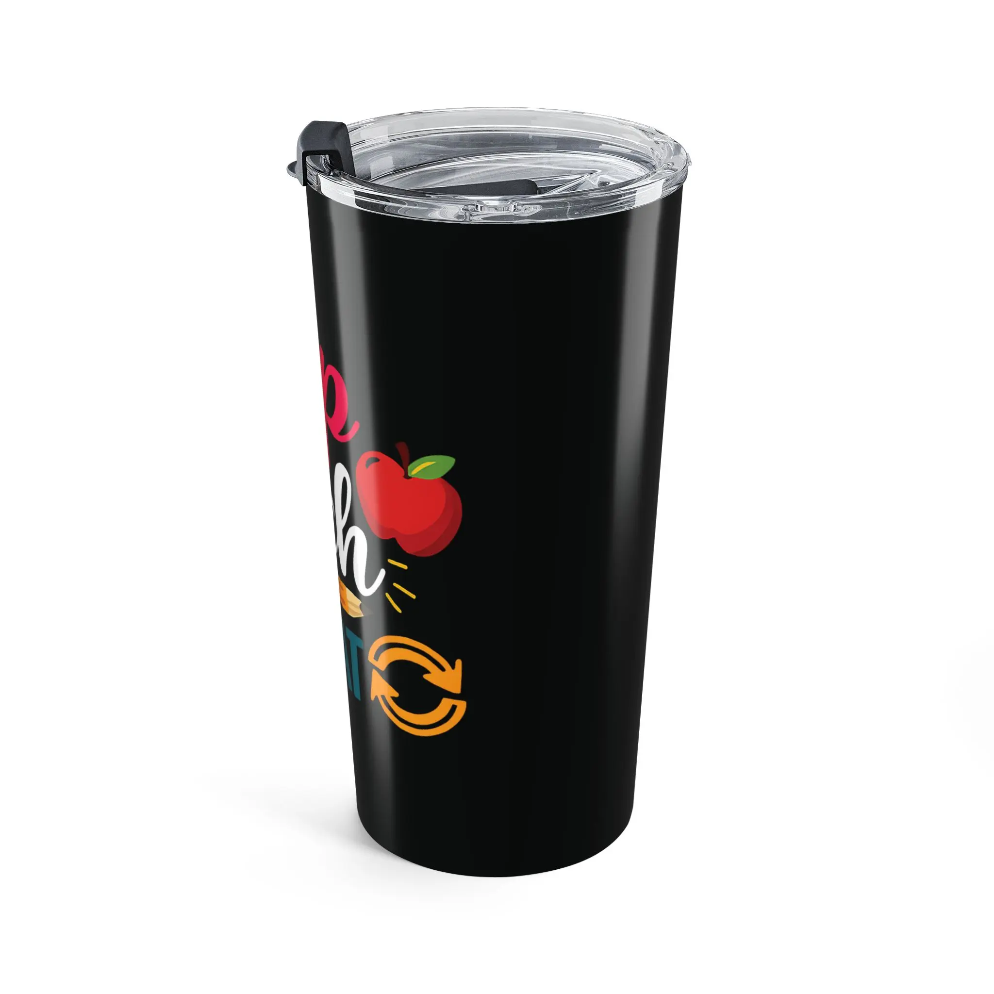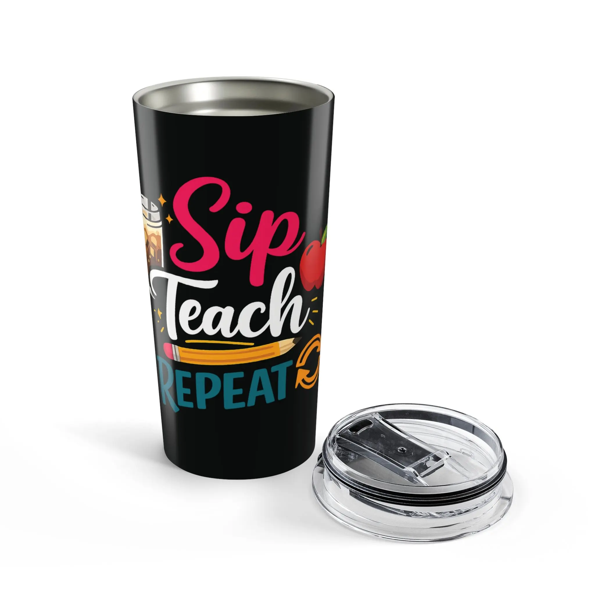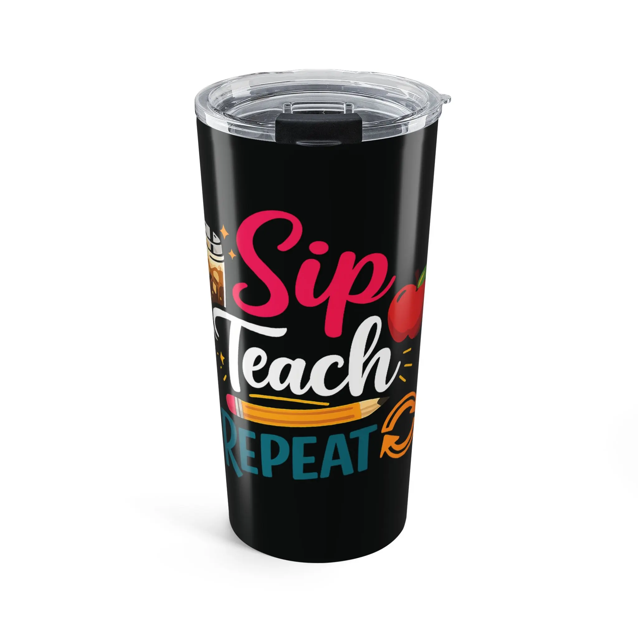 This 20oz stainless steel tumbler is made to travel through long school days and quiet grading nights with you. The glossy, full-color wraparound print announces a playful classroom rhythm—Sip, Teach, Repeat—while the vacuum-insulated double-wall body holds morning coffee hot or iced tea cold. A clear push-on lid with rubber gasket seals in warmth (or chill) and helps prevent spills during the school run. Rounded corners and a slim profile slip into backpacks and cup holders. Durable, dishwasher-safe construction means it stands up to busy routines and keeps its shine semester after semester.