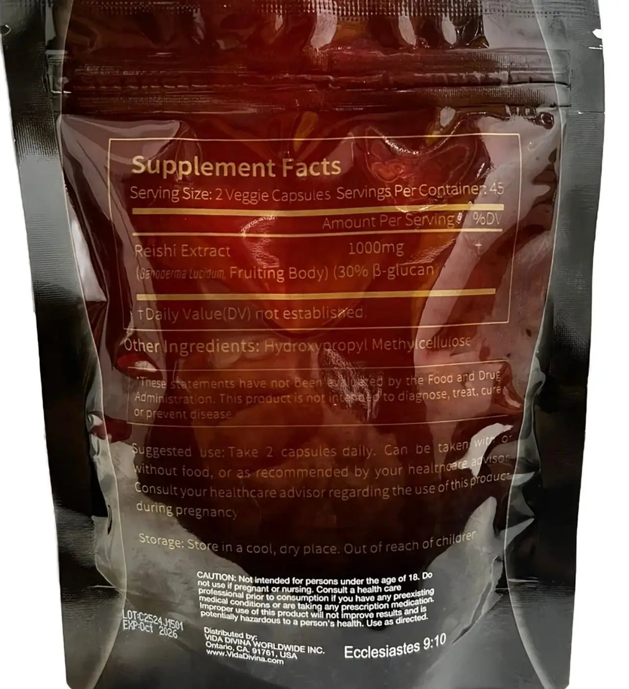Reishi Capsules by Vida Divina is a dietary supplement made with reishi mushroom extract. Reishi has been traditionally used as part of a balanced lifestyle and is valued for its natural origin.