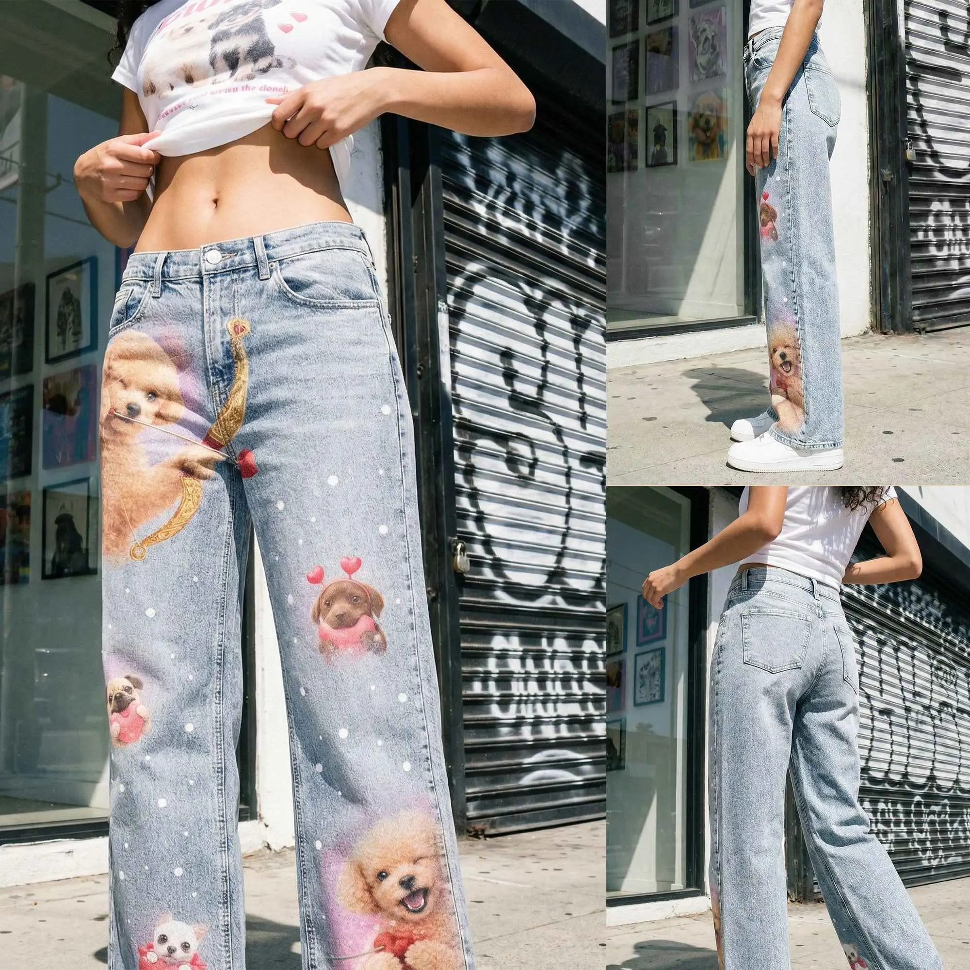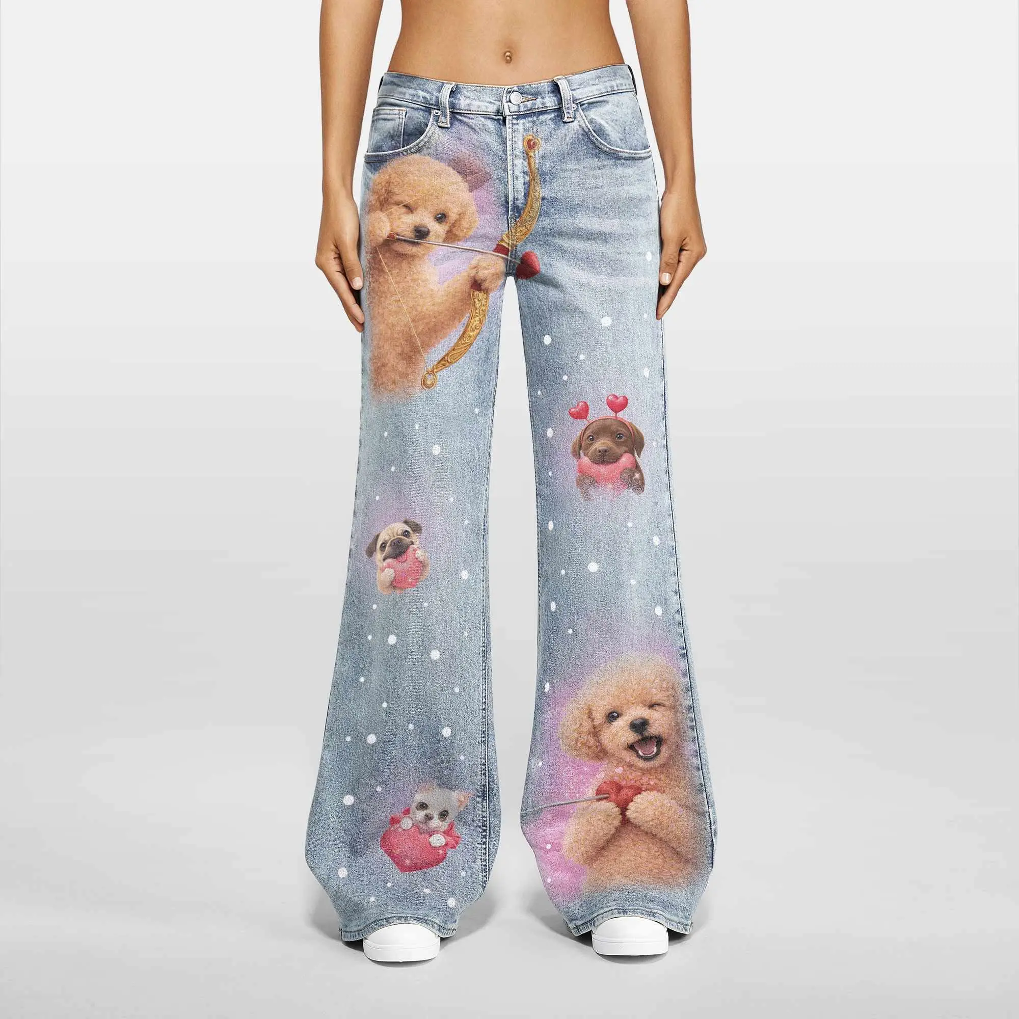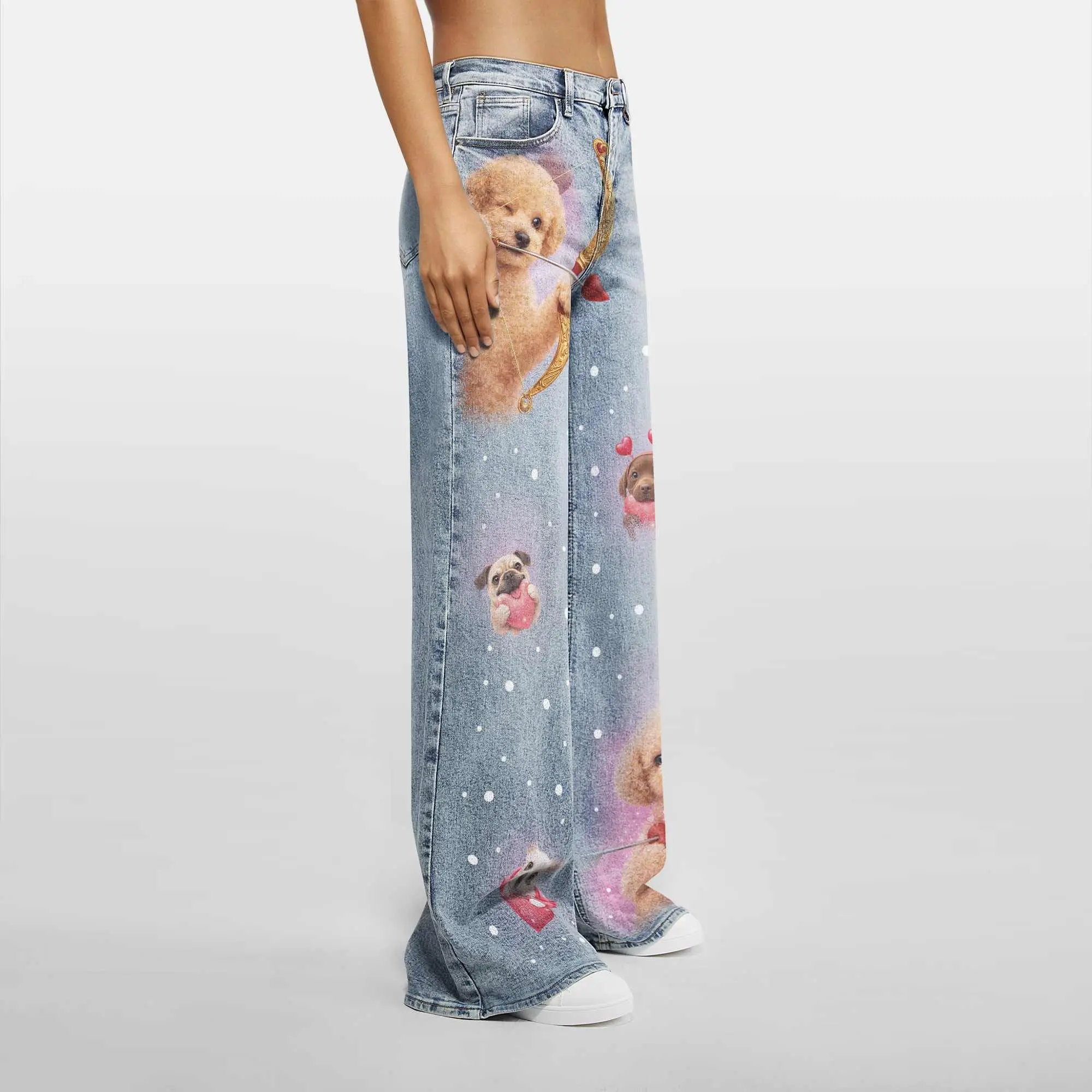 These light-wash denim jeans feature adorable cupid puppy and heart prints for a soft, dreamy Y2K aesthetic. Designed with a flattering high waist and relaxed wide-leg fit, they give you that perfect baggy streetwear look while staying comfortable all day. Made from soft denim with slight stretch, easy to style for casual, cute, or statement outfits.