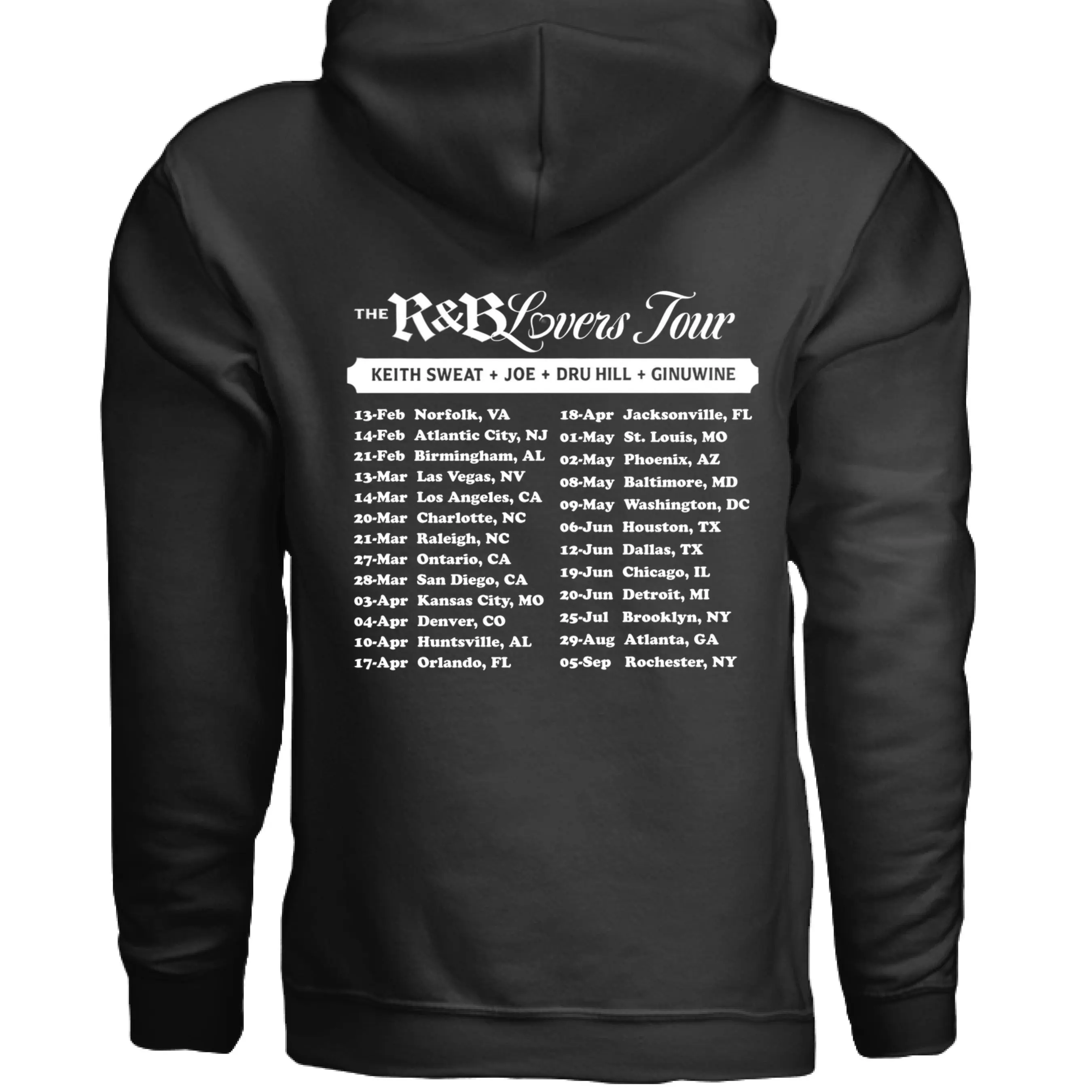 A must have hoodie for true R&B fans. Featuring a bold KEITH SWEAT graphic on the front and the full R&B Lovers Tour lineup with tour dates on the back, this hoodie celebrates classic soul and timeless vibes.