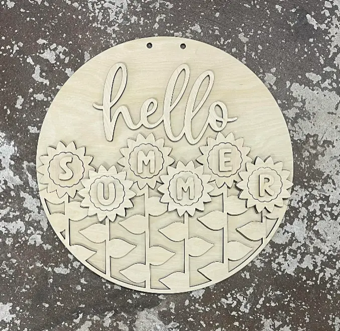 Celebrate the sunny season with our 15” Hello Summer Sunflowers Layered Round Craft Wood Blank! This cheerful layered design features bright sunflowers paired with a warm “Hello Summer” greeting, making it the perfect door hanger for welcoming the season.