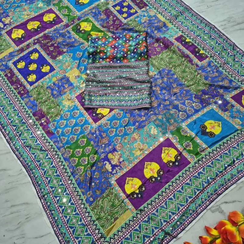 Multicolor Chinon Silk Saree With Mirror Work included unstitched blouse