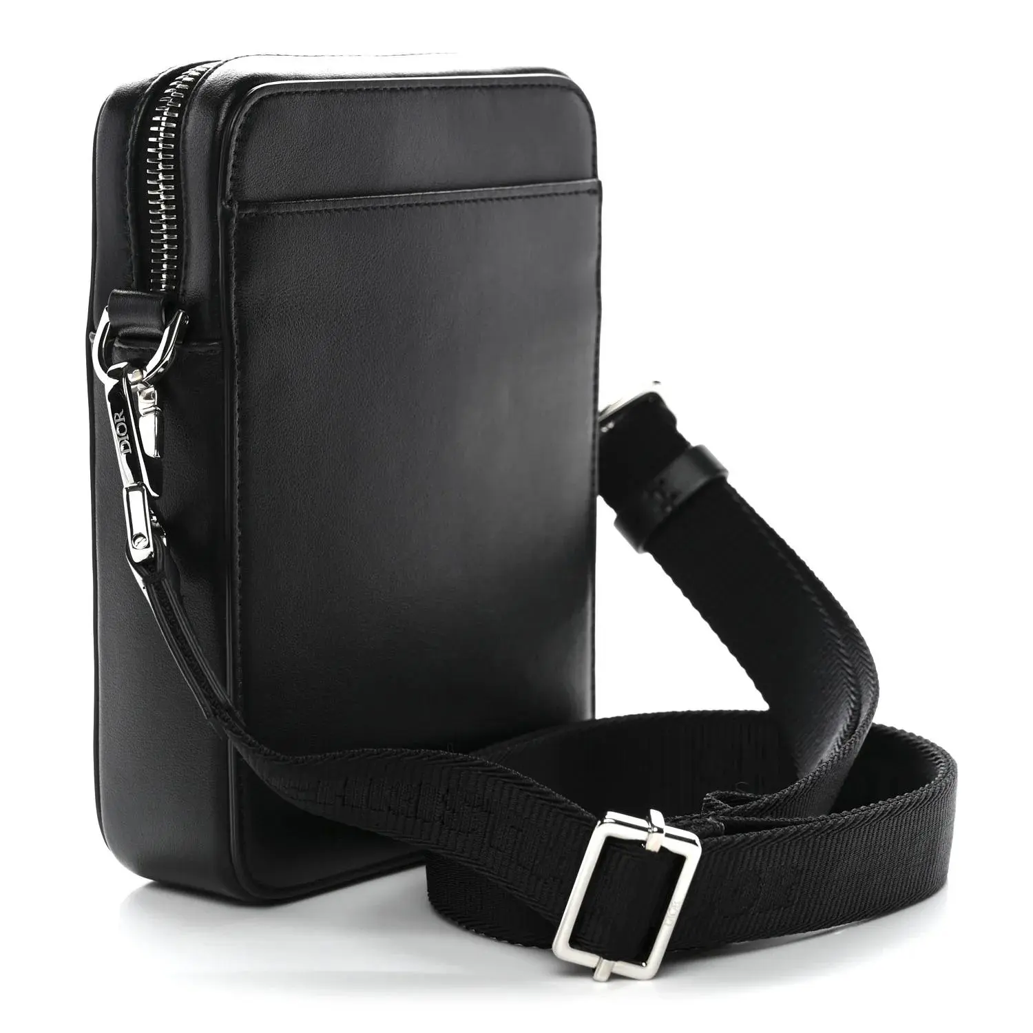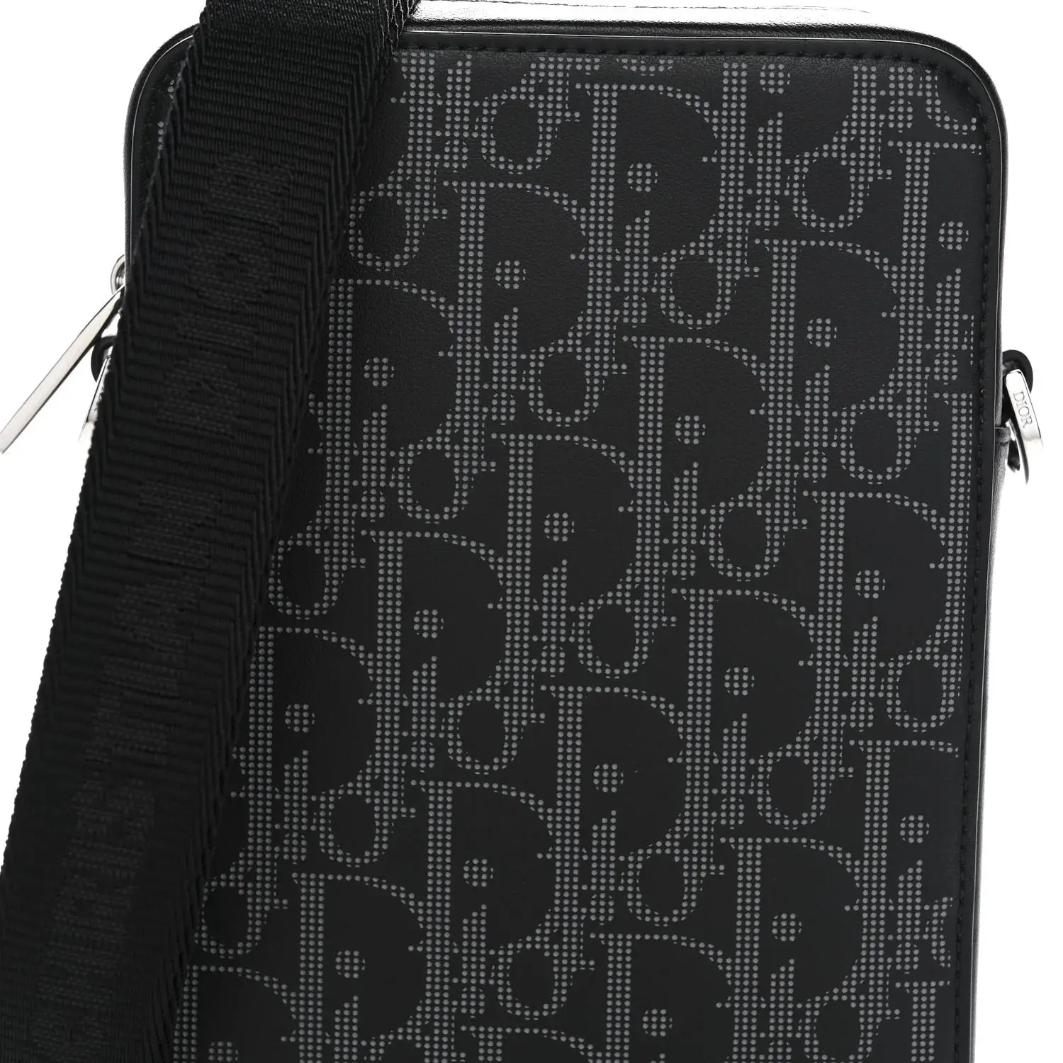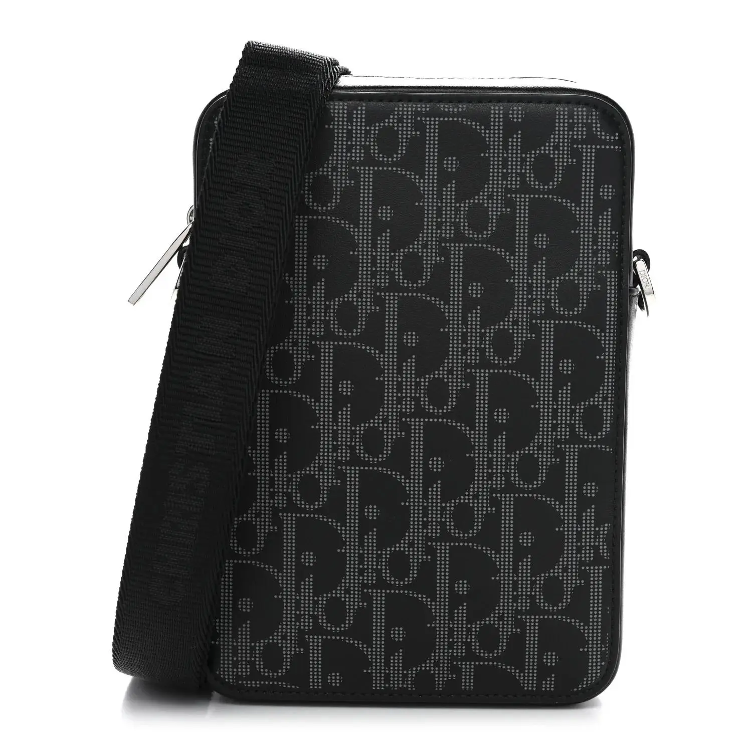 This is an authentic CHRISTIAN DIOR Calfskin Oblique Galaxy Perforated World Tour Messenger Pouch in Black. This bag is finely crafted of black Dior monogram perforated calfskin leather. The bag features smooth leather trim, an adjustable black nylon shoulder strap, and silver hardware. The top zippers open to a black fabric interior.