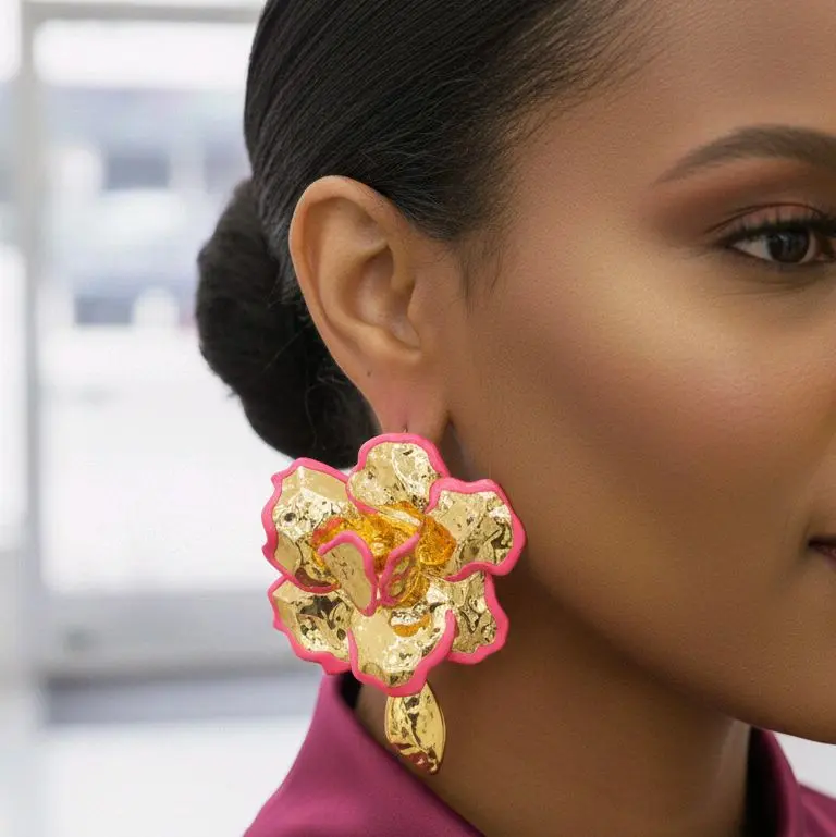 These aren't just earrings—they're wearable works of art. Our Gilded Fête Statement Earrings are designed for the confident and modern woman who makes a statement without saying a word. Inspired by high-fashion garden glamour, they blend bold color with luxurious texture for a truly unforgettable look. Design & Structure: These earrings feature a striking, oversized three-dimensional floral design. The intricate layering of the petals creates depth and movement, catching the light from every angle.