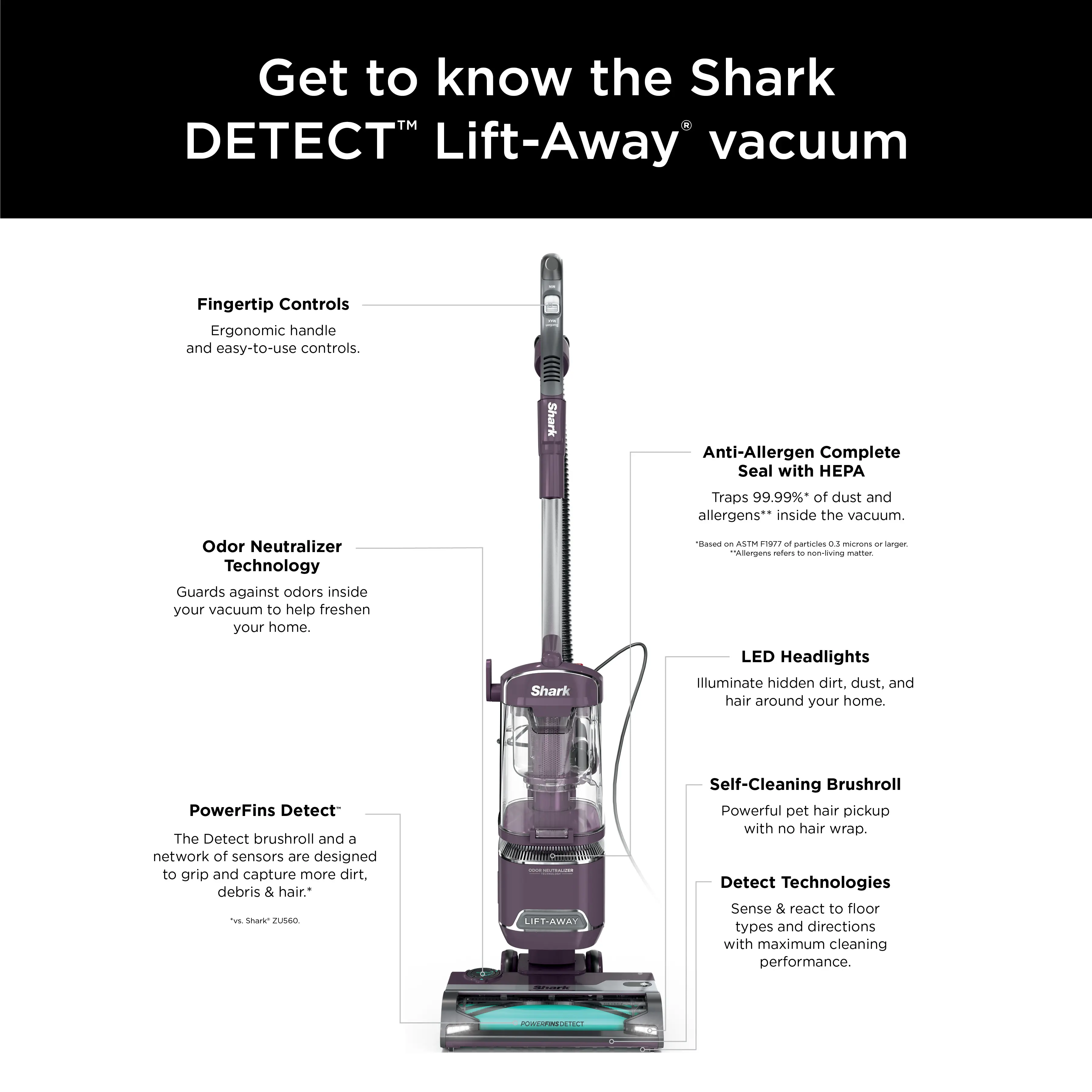 The Shark DETECT Lift-Away corded upright vacuum combines powerful suction with cutting-edge Detect Technology. The Detect nozzle with Intelli-Sense smart sensor automatically reacts to floor types by boosting brushroll speed where you need it most. Lift-Away technology lets you detach the pod for above-floor cleaning. Anti-Allergen Complete Seal with HEPA filtration traps 99.99%* of dust, dander, and allergens. *Based on ASTM F1977, down to 0.3 microns.