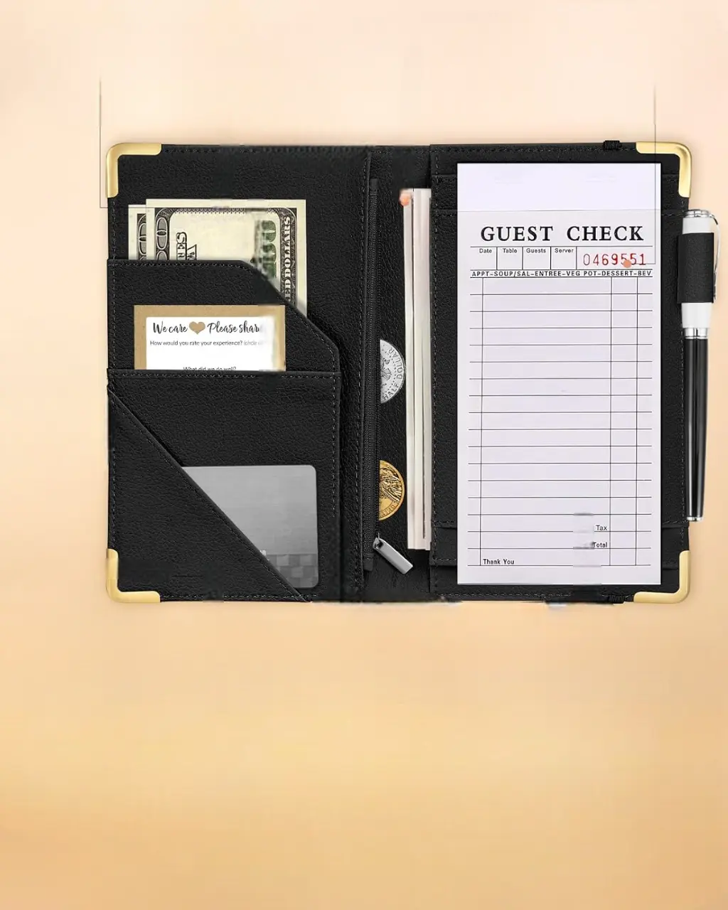 ·7 STORAGE COMPARTMENTS: Designed for efficiency, this waitress book includes 7 functional pockets: slots for credit cards and payment cards, a coupon or menu pocket, bill pocket, coin zipper pocket, cash compartment, guest check holder, and a pen holder. The secure zipper pocket keeps coins safe, and the elastic pen loop fits pens of various sizes.
