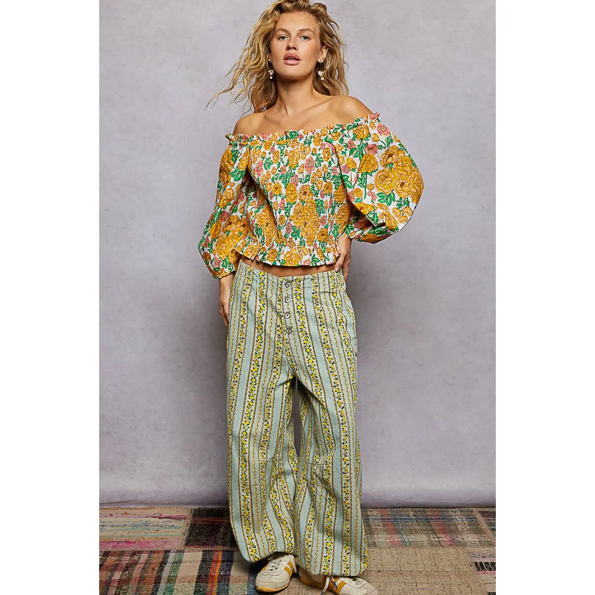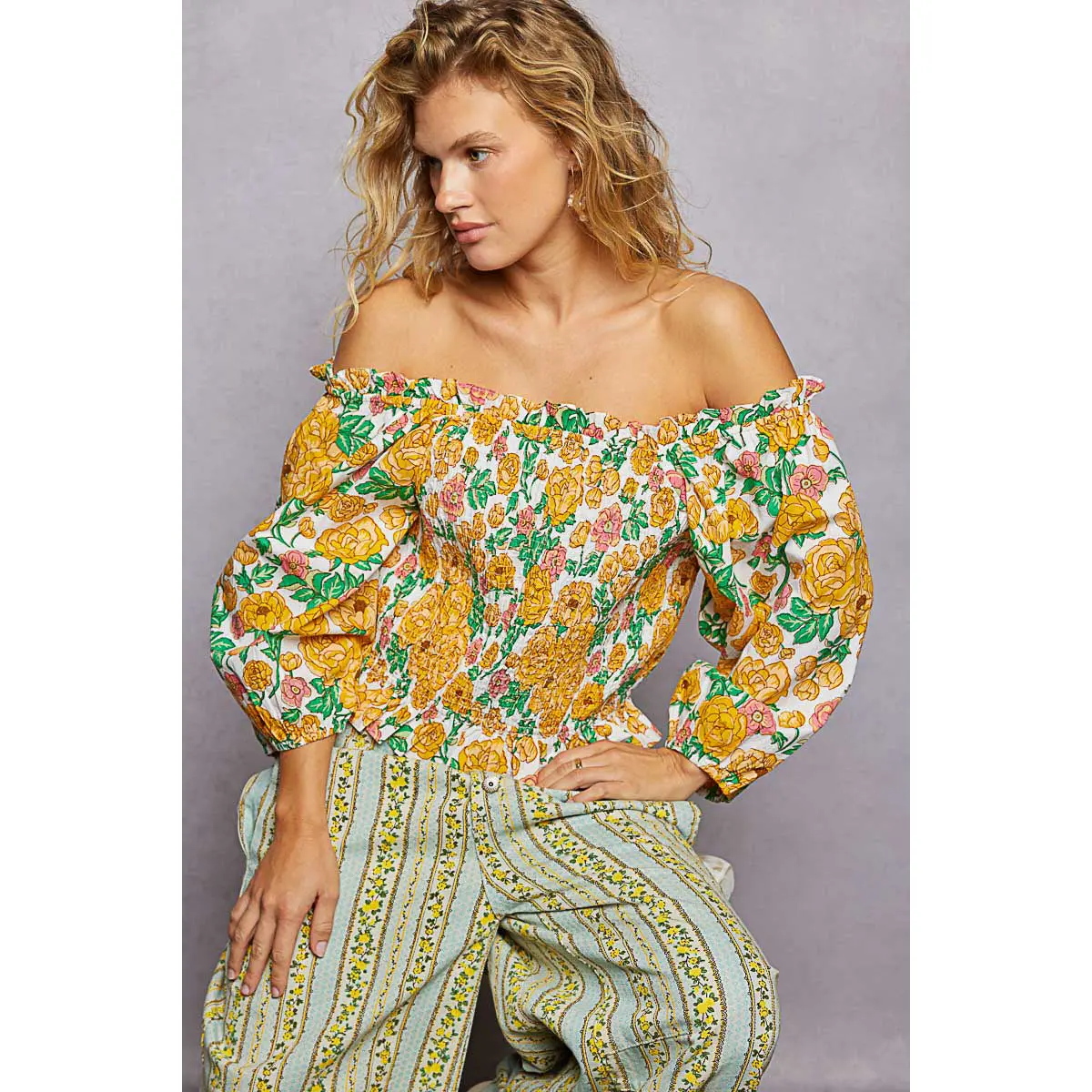 This printed woven top features an off-the-shoulder neckline and a fully smocked bodice for a secure, flattering fit. It has softly puffed 3/4 sleeves, a subtle ruffled hem, and a fresh floral motif with lightweight drape. This easy statement piece adds shape, texture, and color to warm-weather styling.
