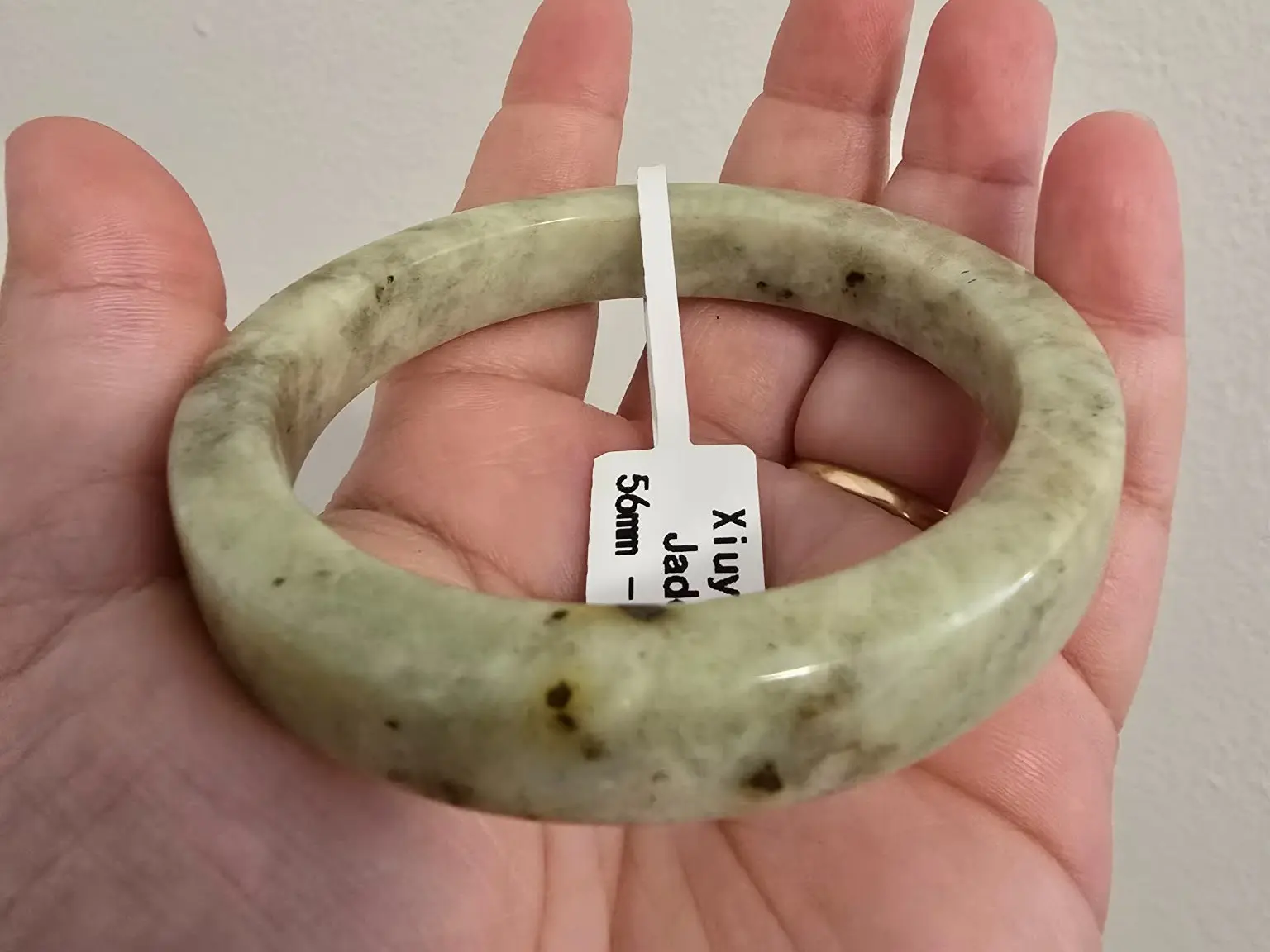 This natural Xiuyan Jade bangle features a soft earthy green tone with natural mineral spotting, giving it a grounded, organic feel. The subtle variations and darker inclusions make each piece unique, like a little piece of nature you can wear.