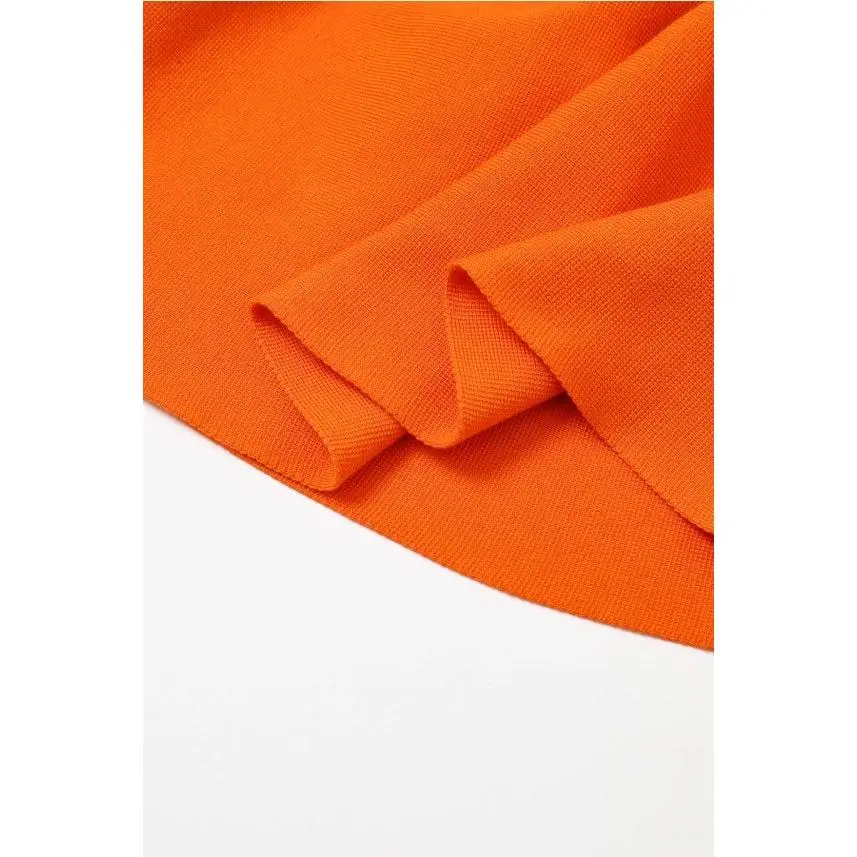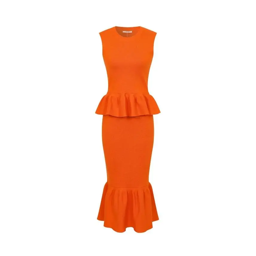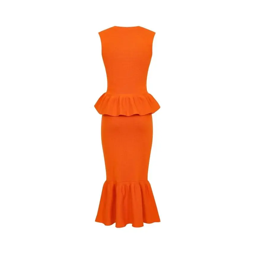 Turn heads in our tangerine orange knit peplum top and midi skirt set, designed to sculpt and flatter in all the right places. The sleeveless top features a round neckline and a structured peplum waist that enhances your natural shape, while the fitted midi skirt with a soft flounce hem creates a sleek, feminine silhouette. Made from a medium weight knit, this set offers full coverage with no see-through and comfortable stretch that moves with your curves. Perfect for events, brunch, or an elevated everyday look, this set delivers bold color with polished style. Wear it together for a standout statement or style each piece separately for versatile outfits.