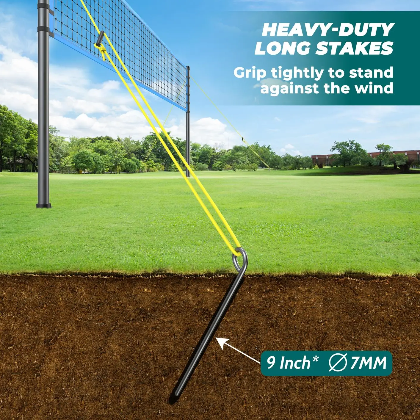Our volleyball net is regulation size, made from 24-ply PE material that's strong and tear-resistant, perfect for high-impact games. Reinforced with 3-inch side tapes and 1.5-inch top net tape, it ensures stability and minimizes sagging. Included is an 8.5-inch machine-stitched volleyball with a soft PU cover, reducing impact on your arms and hands. Inflate it easily with the included pump, which features 2 hidden needles on the handle. This volleyball is perfect for practice or family fun. The volleyball set features height-adjustable steel poles with a push-button locking system for quick setup and an eye bolt system for easy height adjustment. Choose from men's (8'), women's (7'4''), and co-ed (7'8'') playing heights. Perfect for backyard fun or beach volleyball in the backyard or outdoors. The volleyball net set comes with a durable 600D Oxford carrying bag for easy storage and transportation. Whether you're heading to the beach, park, or backyard, this portable design ensures your volleyball set is always ready to go. This volleyball set for Backyard includes everything you need: a volleyball net, premium steel poles, a volleyball, guide ropes with metal stakes, a boundary line with spool, a ball pump with 2 needles, a hammer, and a carrying bag. Perfect for backyard reunions, beach days, camping trips, or social events.