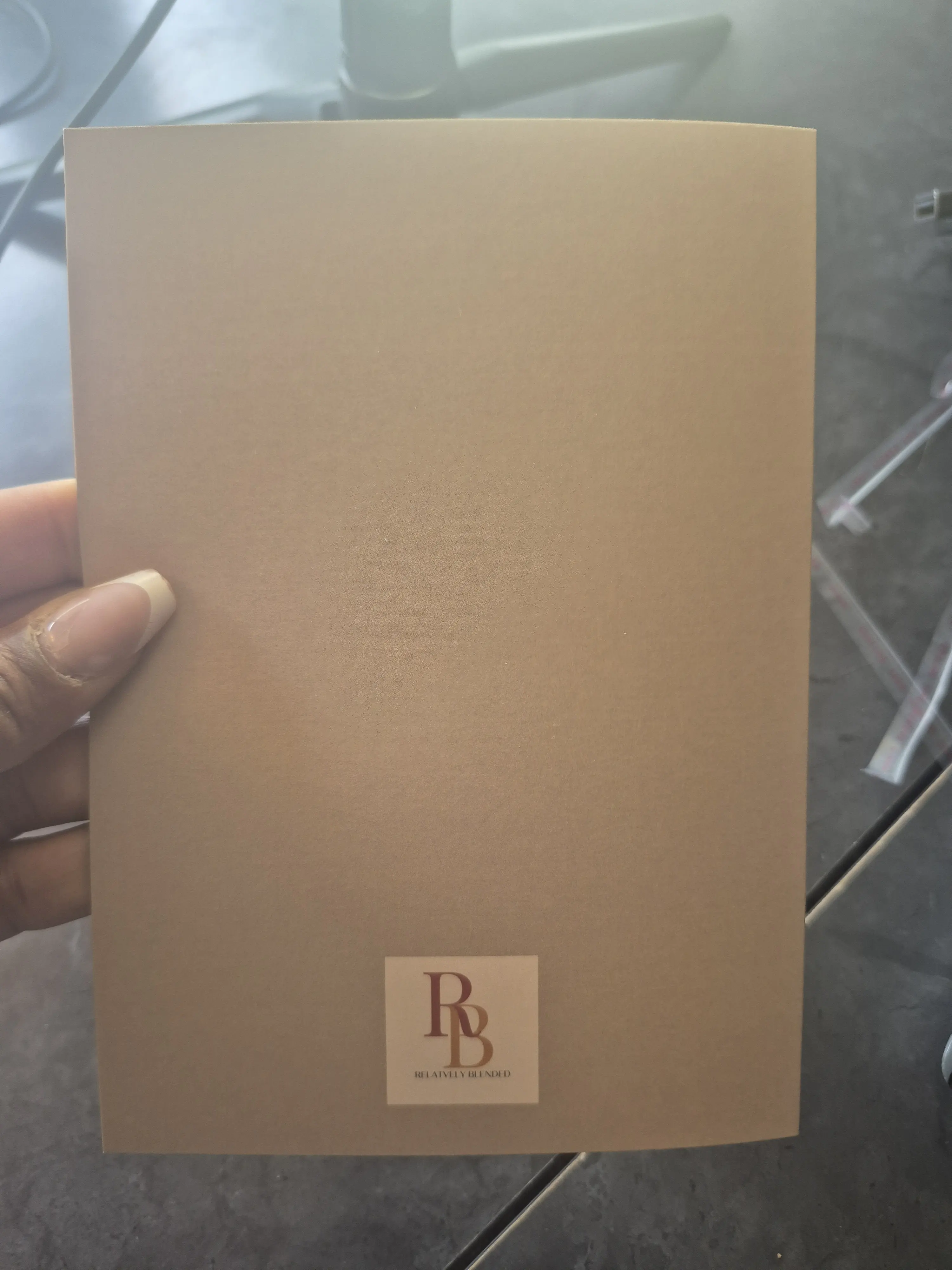 Design: Printed text on the front and inside, with Relatively Blended logo on the back.