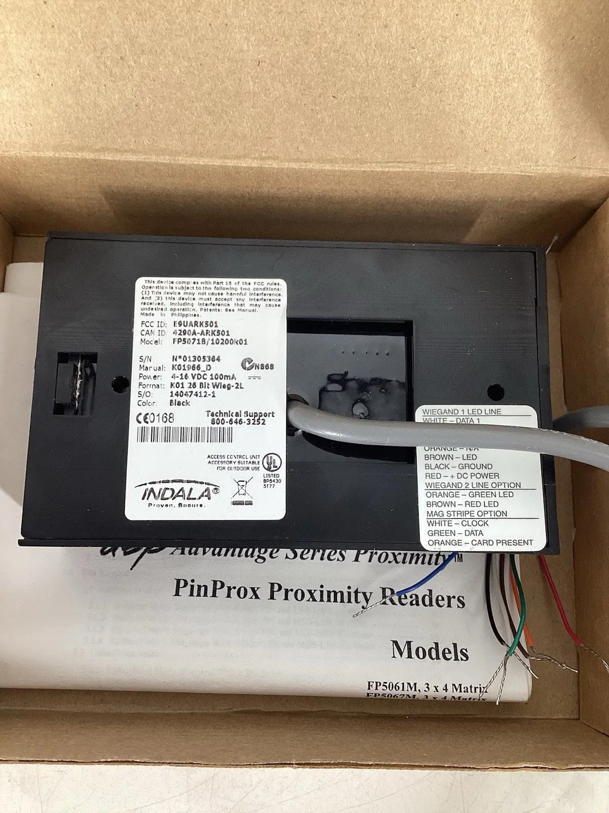 This listing is for a HID Indala access control reader, model FP5071B/10200K01, identified on the label as EQUARK501. Unit appears to be Brand New and includes the attached cable/wiring harness shown in the photos.
