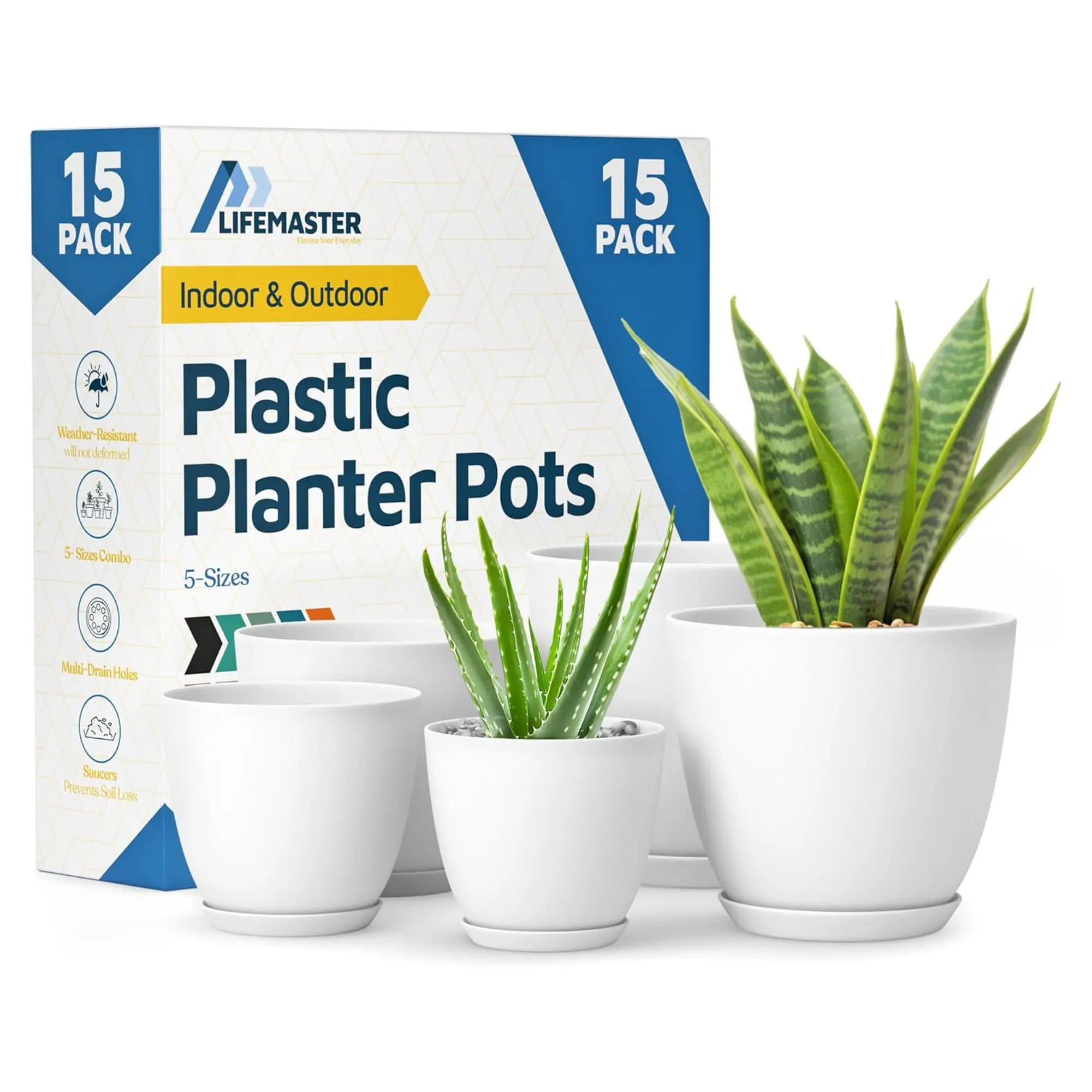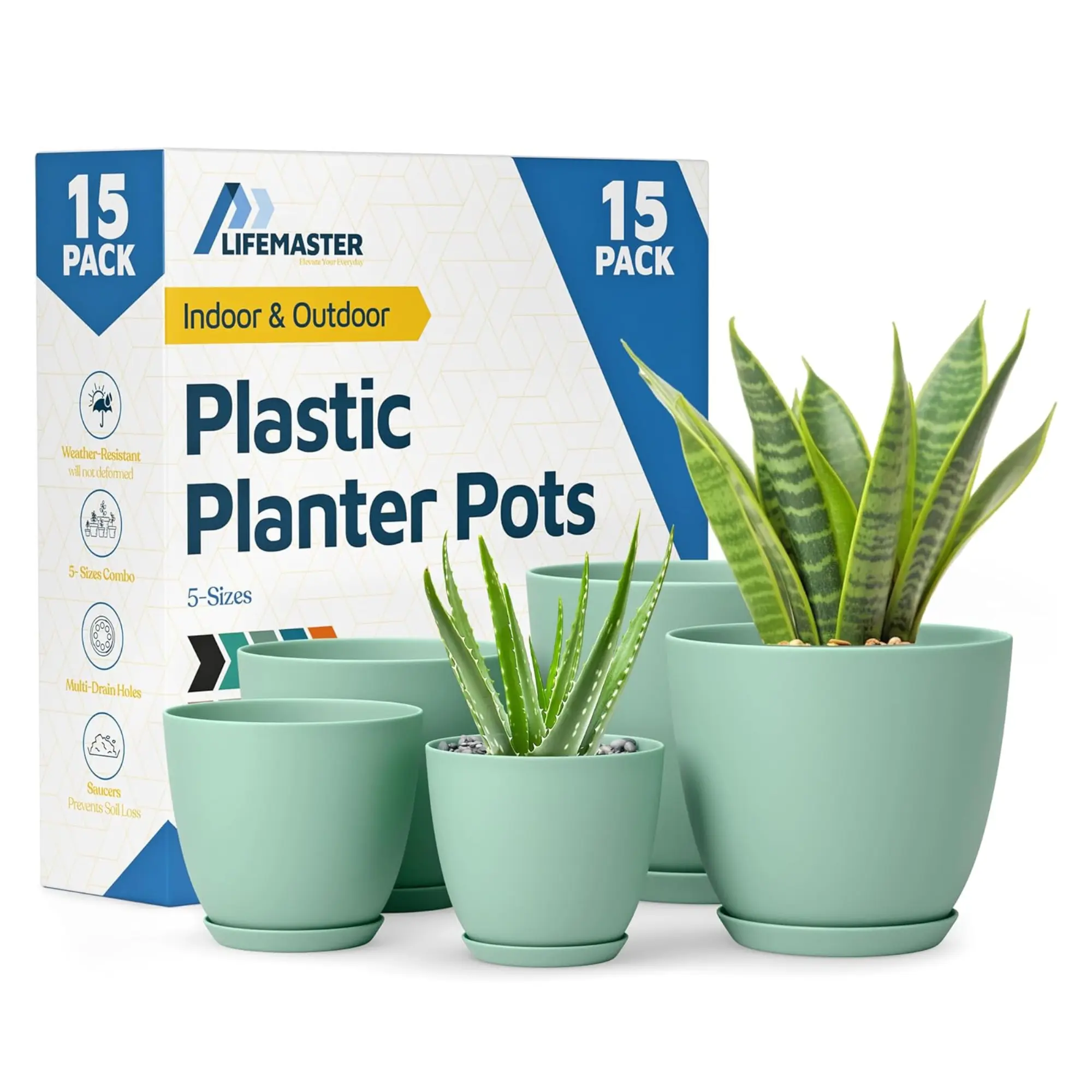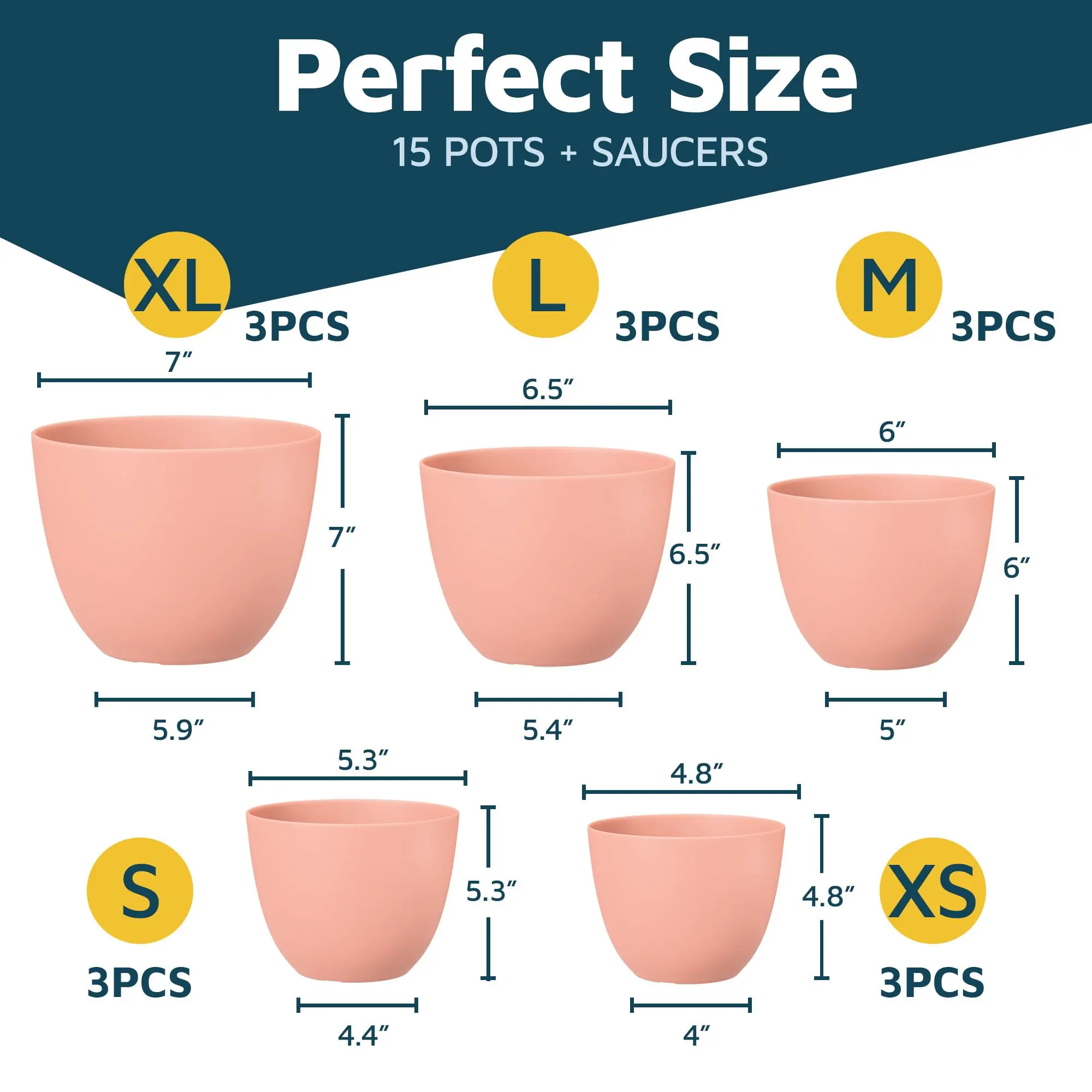 Plant Pots with Drainage Holes & Saucers 15 Pack, Indoor & Outdoor Stackable Space-Saving Planters for Houseplants & Flowers, (7", 6.7", 6", 5.3", and 4.8" Inches), Durable & Weatherproof